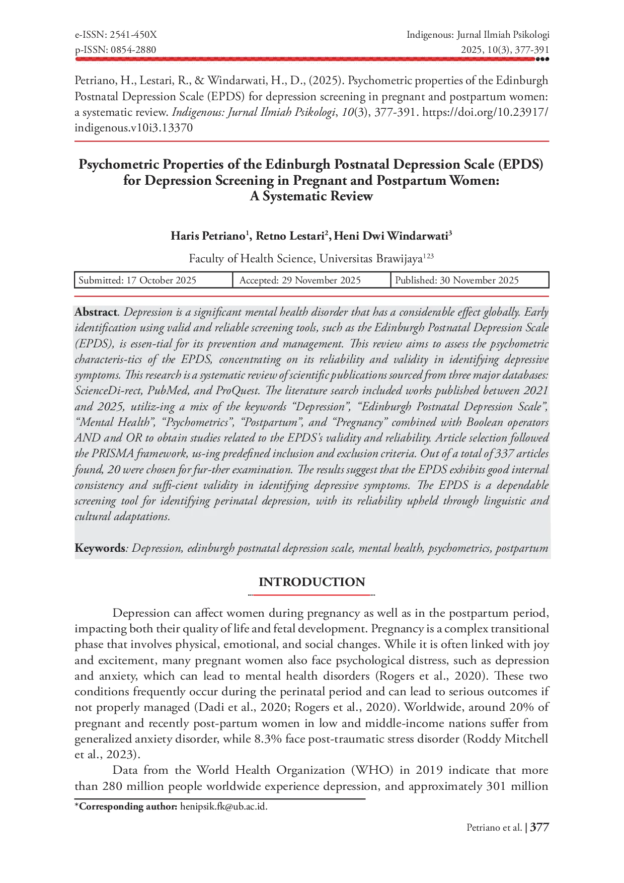 Indigenous: Jurnal Ilmiah PsikologiIndigenous: Jurnal Ilmiah PsikologiDepresi adalah gangguan kesehatan mental yang signifikan dan memiliki dampak global yang besar. Identifikasi dini menggunakan alat skrining yang valid dan andal, seperti Edinburgh Postnatal Depression Scale (EPDS), sangat penting untuk pencegahan dan pengendaliannya. Tinjauan sistematis ini bertujuan untuk menilai karakteristik psikometrik EPDS, terutama keandalan dan validitasnya dalam mengidentifikasi gejala depresi. Penelitian ini merupakan tinjauan sistematis dari publikasi ilmiah yang diambil dari tiga basis data utama: ScienceDirect, PubMed, dan ProQuest. Pencarian literatur mencakup karya yang diterbitkan antara tahun 2021 dan 2025, menggunakan kombinasi kata kunci Depresi, Edinburgh Postnatal Depression Scale, Kesehatan Mental, Psikometrik, Postpartum, dan Kehamilan dengan operator Boolean AND dan OR untuk memperoleh studi yang terkait dengan validitas dan keandalan EPDS. Seleksi artikel mengikuti kerangka PRISMA, menggunakan kriteria inklusi dan eksklusi yang telah ditentukan sebelumnya. Dari total 337 artikel yang ditemukan, 20 artikel dipilih untuk pemeriksaan lebih lanjut. Hasilnya menunjukkan bahwa EPDS memiliki konsistensi internal yang baik dan validitas yang cukup dalam mengidentifikasi gejala depresi. EPDS adalah alat skrining yang andal untuk mengidentifikasi depresi perinatal, dengan keandalannya dipertahankan melalui adaptasi linguistik dan budaya.