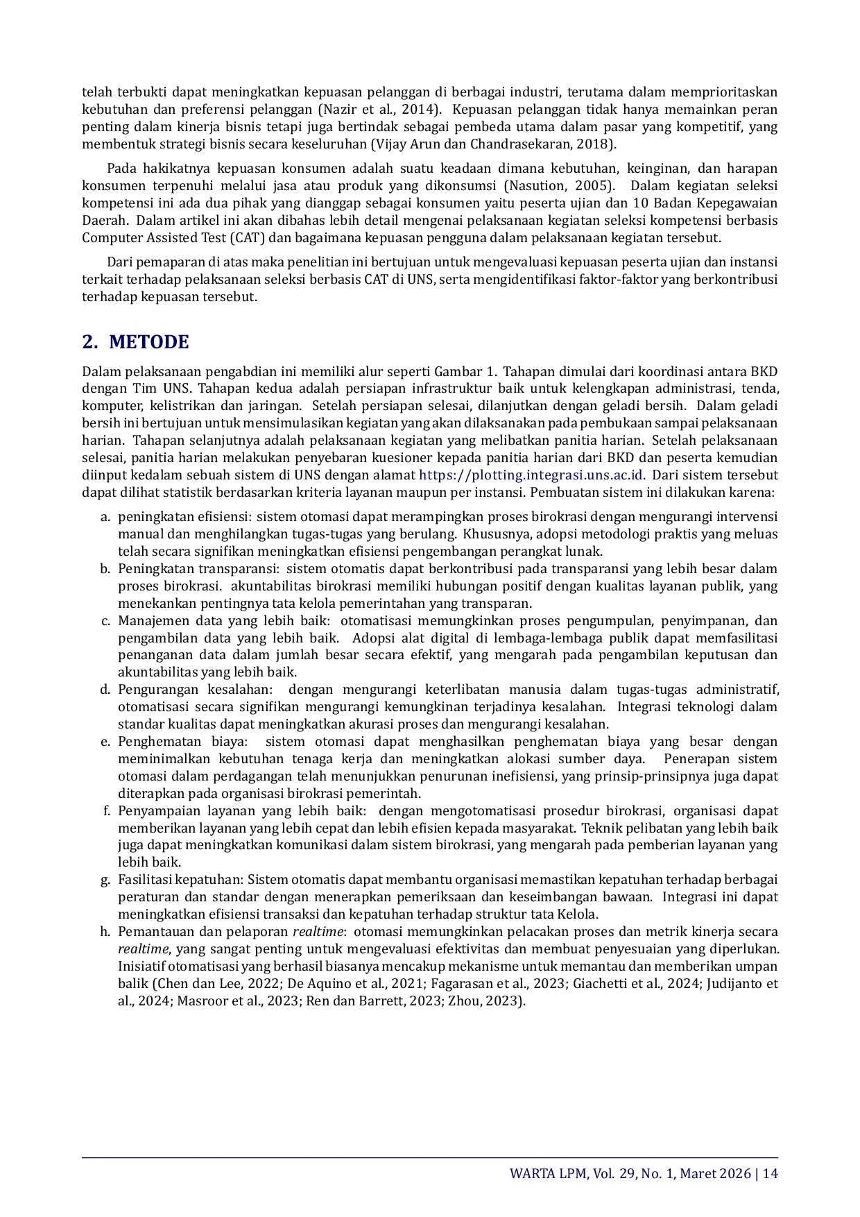Warta LPMWarta LPMKepuasan pelanggan merupakan hal yang sanget penting dalam sebuah layanan apalagi dalam proses seleksi kompetensi berbasis Computer Assisted Test (CAT). Proses seleksi ini merupakan bagian penting dalam menciptakan birokrasi negara yang profesional dan berkualitas tinggi: (1) Latar belakang permasalahan: Namun, implementasi CAT secara besar‐besaran dalam rekrutmen sektor publik belum selalu disertai dengan evaluasi sistematis terhadap kepuasan peserta, terutama terkait kualitas layanan, keandalan sistem, dan konsistensi antar lembaga penyelenggara.; (2) Tujuan: Penelitian ini bertujuan mengevaluasi kepuasan peserta ujian dan instansi terkait terhadap pelaksanaan seleksi berbasis CAT di UNS; (3) Metode: Evaluasi digunakan kuesioner dalam 19 pertanyaan tertutup dengan skala likert 1‐4. Kuesioner yang sudah dibagikan kepada responden yaitu peserta ujian dan Badan Kepegawaian Daerah dengan jumlah responden sebanyak 920 responden, dengan isi kuesioner berupa faktor penentu utama seperti kualitas sistem, informasi, dan layanan yang dibagikan secara random; (4) Hasil: Instansi terbaik hasil kuesioner ini adalah layanan untuk Pemerintah Kabupaten Pati dengan skor 3,73 dan terendah adalah Pemerintah Kabupaten Karanganyar yaitu 3,38. Hasil pengukuran kepuasan pelanggan secara umum memberikan nilai 3,54 dan (5) Kesimpulan: Hasil akhir dari pengukuran memberikan arti bahwa layanan ini mendapatkan kinerja yang sangat baik (6) Rekomendasi atau tindak lanjut: Saran implementasi mendatang dari CAT meningkatkan standarisasi layanan, mempersiapkan bantuan teknis, dan melakukan penilaian berkelanjutan terhadap kepuasan peserta untuk memastikan proses ujian yang lebih seragam dan berorientasi pada peserta.