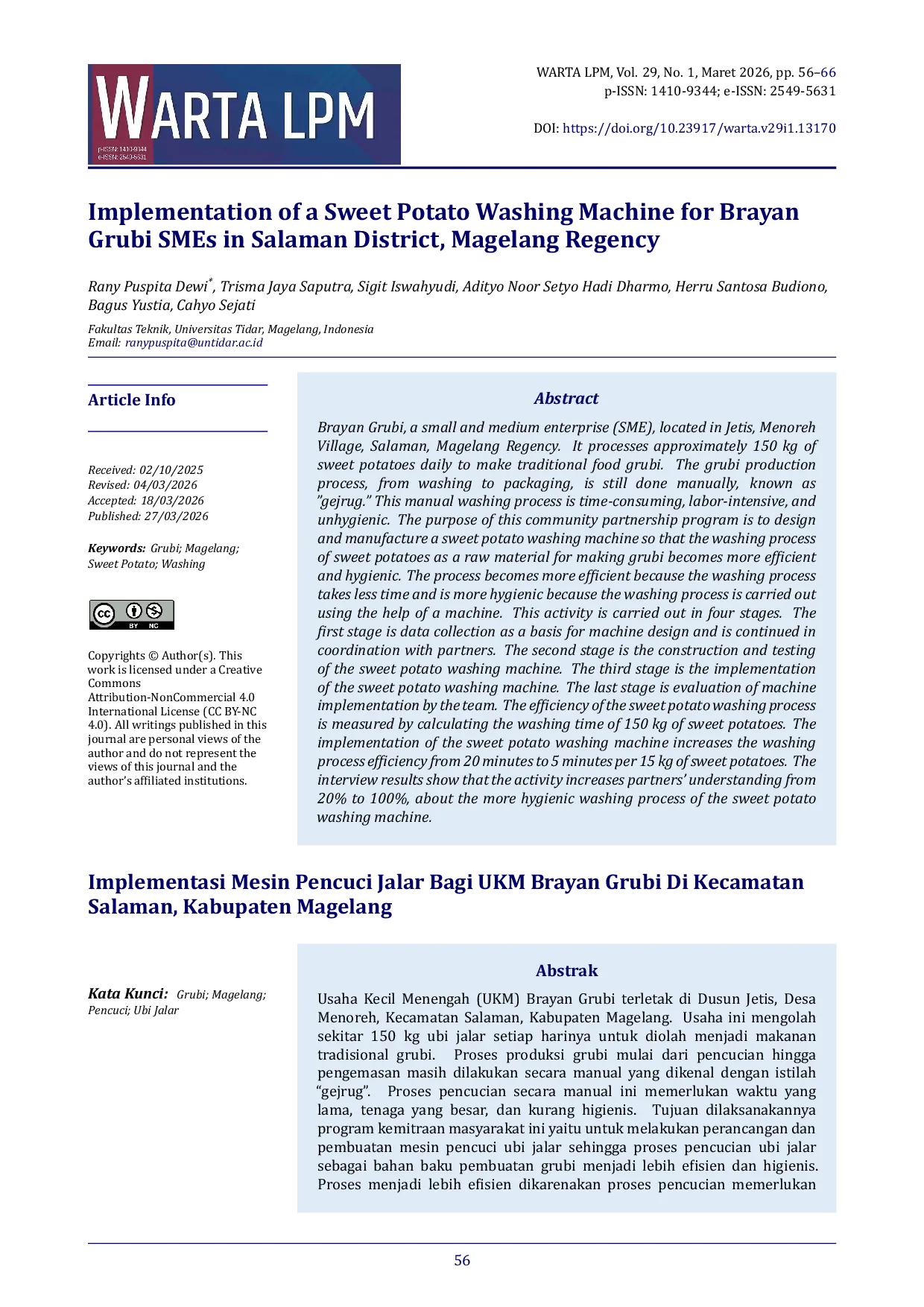Warta LPMWarta LPMUsaha Kecil Menengah (UKM) Brayan Grubi terletak di Dusun Jetis, Desa Menoreh, Kecamatan Salaman, Kabupaten Magelang. Usaha ini mengolah sekitar 150 kg ubi jalar setiap harinya untuk diolah menjadi makanan tradisional grubi. Proses produksi grubi mulai dari pencucian hingga pengemasan masih dilakukan secara manual yang dikenal dengan istilah “gejrug. Proses pencucian secara manual ini memerlukan waktu yang lama, tenaga yang besar, dan kurang higienis. Tujuan dilaksanakannya program kemitraan masyarakat ini yaitu untuk melakukan perancangan dan pembuatan mesin pencuci ubi jalar sehingga proses pencucian ubi jalar sebagai bahan baku pembuatan grubi menjadi lebih efisien dan higienis. Proses menjadi lebih efisien dikarenakan proses pencucian memerlukan waktu yang lebih singkat dan lebih higienis karena proses pencucian dilakukan menggunakan bantuan mesin. Kegiatan ini dilaksanakan dalam tiga tahapan. Tahapan pertama yaitu pengumpulan data sebagai dasar perancangan mesin dan dilanjukan dengan koordinasi bersama mitra. Tahapan kedua yaitu pembuatan dan pengujian mesin pencuci ubi jalar. Tahapan ketiga yaitu implementasi mesin pencuci ubi jalar. Tahapan terakhir yaitu evaluasi penerapan mesin oleh tim. Capaian efisiensi proses pencucian ubi jalar diukur dengan menghitung waktu pencucian dari 150 kg ubi jalar. Implementasi mesin pencuci ubi jalar mampu meningkatkan efisiensi proses pencucian dari 20 menit menjadi 5 menit per 15 kg ubi jalar. Hasil wawancara menunjukkan bahwa kegiatan ini dapat meningkatkan wawasan mitra dari 20% menjadi 100% terkait proses pencucian yang lebih higienis tentang mesin pencuci ubi jalar.