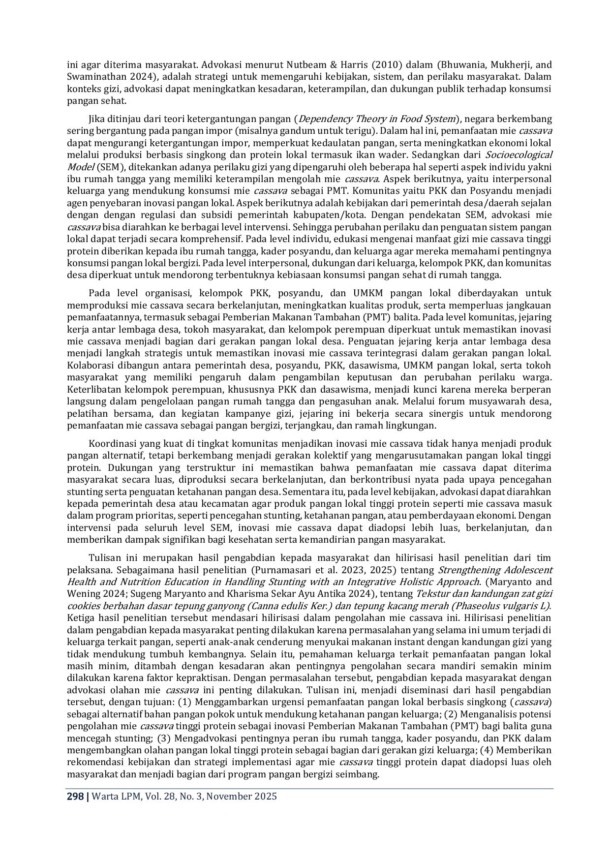 Warta LPMWarta LPMTujuan dari program ini adalah untuk meningkatkan pemahaman ibu balita dan kader posyandu tentang manfaat cassava sebagai sumber karbohidrat alternatif serta memperkenalkan formulasi mie cassava tinggi protein yang dapat diproduksi secara mandiri di tingkat rumah tangga. Objek kegiatan mencakup Tim Penggerak PKK Kelompok Kerja 4, Kader Posyandu, dan kader Kesehatan di desa mitra. Selain itu, advokasi pengolahan mie cassava berbasis pangan lokal tinggi protein dikembangkan sebagai upaya pemenuhan gizi balita melalui Pemberian Makanan Tambahan (PMT) yang mudah diterima masyarakat serta mendukung ketahanan pangan keluarga. Metode yang digunakan meliputi pendekatan partisipatif melalui sosialisasi gizi keluarga, demonstrasi pengolahan mie cassava, serta diskusi kelompok terarah untuk menggali persepsi dan kebutuhan masyarakat. Data dikumpulkan melalui observasi, wawancara singkat, dan penilaian penerimaan produk. Advokasi diterapkan dengan memberikan pelatihan dalam pengolahan mie cassava dengan 30% teoretik dan 70% praktik. Teknologi Tepat Guna/TTG dihilirisasikan kepada peserta dengan harapan pengetahuan yang diperoleh dapat berkelanjutan. Hasil kegiatan menunjukkan bahwa mie cassava tinggi protein diterima dengan baik oleh ibu balita karena dianggap sebagai variasi makanan tambahan yang bergizi, mudah dibuat, dan menggunakan bahan lokal yang terjangkau. Kader posyandu juga menyatakan kesiapan untuk mengintegrasikan inovasi ini sebagai bagian dari menu PMT rutin. Disarankan agar produksi mie cassava difasilitasi melalui pelatihan lanjutan, dukungan alat sederhana, dan kolaborasi dengan PKK serta UMKM pangan lokal agar keberlanjutannya terjamin. Selain itu, perlu dilakukan uji kandungan gizi lebih komprehensif dan pemantauan dampak terhadap status gizi balita untuk memperkuat dasar ilmiah program.