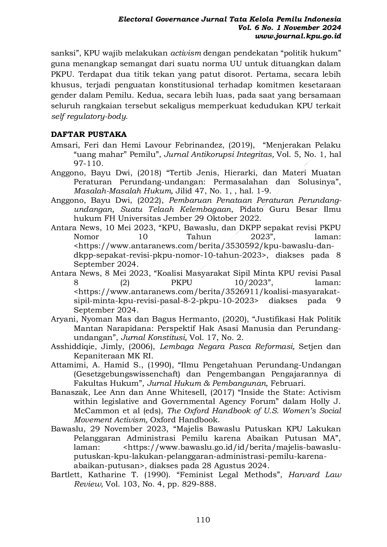 Electoral Governance Jurnal Tata Kelola Pemilu IndonesiaElectoral Governance Jurnal Tata Kelola Pemilu IndonesiaTulisan ini mengeksplorasi kedudukan Komisi Pemilihan Umum (KPU) sebagai self-regulatory body. Lebih spesifiknya, sejauh apa kewenangan KPU untuk menerjemahkan norma Undang-Undang ke dalam regulasi pelaksana. Kajian dilakukan dengan berangkat pada polemik “kuota gender dalam Pemilu 2024. Metode penulisan dilakukan melalui pendekatan hukum doktrinal, yaitu mengkaji hukum positif dengan mengolah dokumen-dokumen hukum yang tersedia. Dalam pembahasannya, norma Undang-Undang tidak mengatur tentang metode penghitungan dan sanksi untuk pemenuhan kuota gender. Melalui pembacaan ilmu perundang-undangan secara historikal-sistematik dalam norma Pemilu pasca-reformasi, ditemukan setidaknya dua pola. Pertama, dimana KPU menerapkan metode pembulatan atas-bawah dengan tanpa sanksi (Pemilu 2009 dan 2024), dan kedua, kebijakan pembulatan ke bawah yang disertai dengan sanksi (Pemilu 2014 dan 2019). Kajian ini menunjukkan bahwa polemik regulasi kuota gender dalam PKPU 10/2023 untuk Pemilu 2024 membawa babak baru kelembagaan KPU. Berbekal dengan preseden legislasi maupun yudisial dari Mahkamah Agung, Mahkamah Konstitusi, kajian ini memberikan dua sisi kesimpulan. Pada satu sisi, meskipun kebijakan kuota gender oleh KPU pada Pemilu 2024 dinyatakan keliru, namun pada sisi yang lain justru sekaligus menguatkan kedudukan KPU sebagai self-regulatory body.