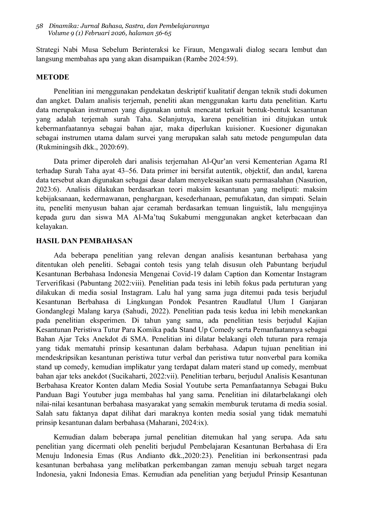 Dinamika: Jurnal Bahasa, Sastra, dan PembelajarannyaDinamika: Jurnal Bahasa, Sastra, dan PembelajarannyaArtikel ini akan mendeskripsikan kesantunan berbahasa Nabi Musa Alaihi Salam dalam terjemahan Al-Quran Surah Taha ayat 43-56. Pendekatan yang digunakan adalah kualitatif deskriptif dengan teori kesantunan dari Leech. Instrumen penelitian menggunakan enam prinsip maksim kesantunan. Data dikumpulkan melalui kajian teks terjemah Al-Quran. Hasil penelitian menunjukkan bahwa kesantunan berbahasa dalam dialog Nabi Musa mencerminkan praktik komunikasi yang penuh ketundukan, kelembutan, dan kebijaksanaan. Keenam maksim kesantunan muncul dalam berbagai bentuk tuturan, seperti permohonan yang merendah, perintah yang lembut, dan sapaan yang mengandung penghormatan. Temuan ini kemudian dijadikan dasar dalam penyusunan bahan ajar siswa kelas XI yang dipandang layak, aplikatif, dan mampu membentuk karakter siswa dalam berbahasa, khususnya dalam menyampaikan ceramah. Penelitian ini merekomendasikan agar nilai-nilai kesantunan dalam kisah para nabi dapat dijadikan rujukan dalam pengembangan bahan ajar Bahasa Indonesia, guna mendukung pembelajaran yang bermakna, kontekstual, dan berbasis karakter.