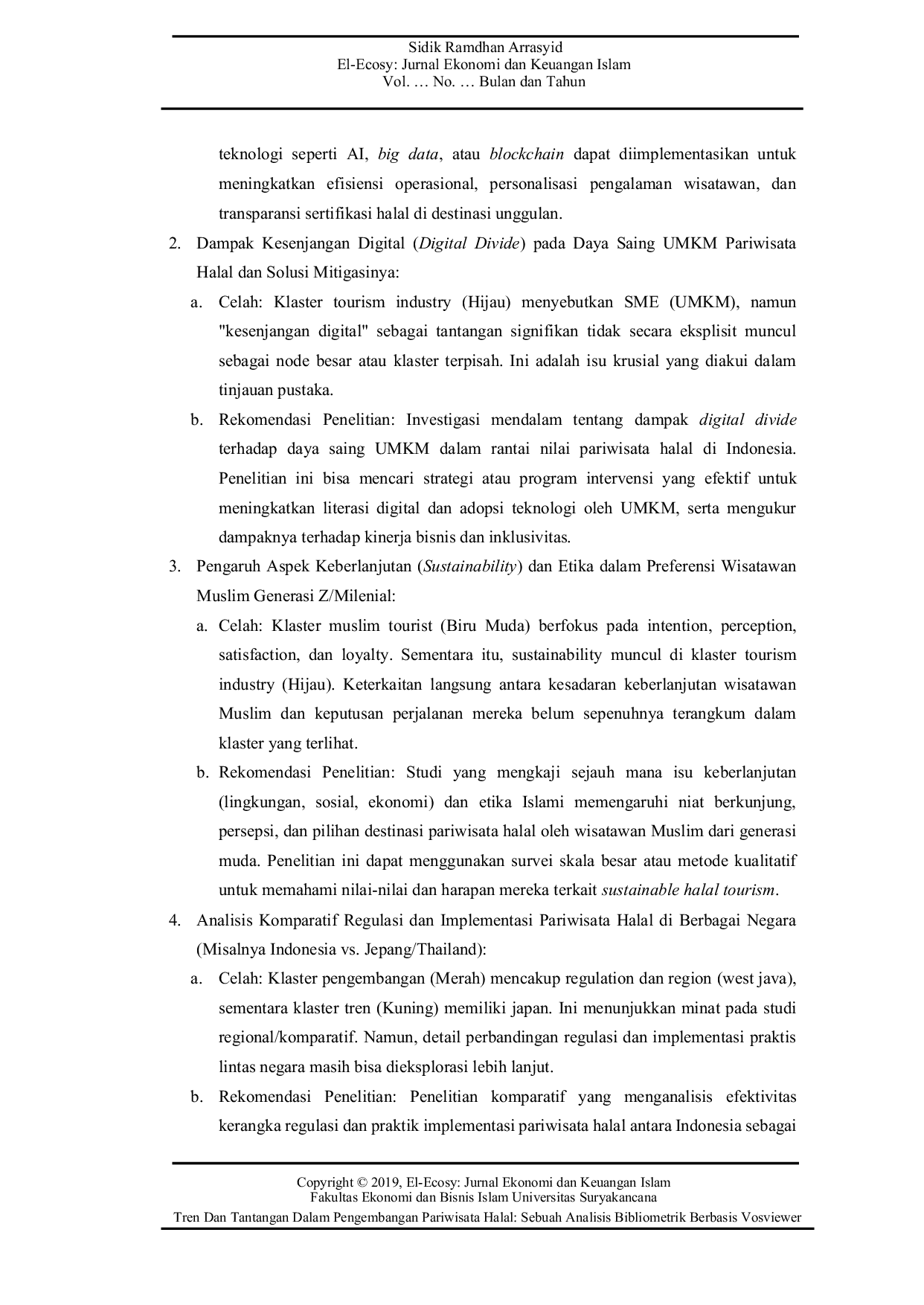 Berdasarkan hasil penelitian, beberapa saran penelitian lanjutan dapat dikembangkan. Pertama, perlu dilakukan studi mendalam mengenai bagaimana teknologi seperti AI, big data, atau blockchain dapat diimplementasikan untuk meningkatkan efisiensi operasional dan personalisasi pengalaman wisatawan dalam pariwisata halal. Kedua, investigasi terhadap dampak kesenjangan digital terhadap daya saing UMKM pariwisata halal, serta strategi untuk meningkatkan literasi digital dan adopsi teknologi oleh UMKM, menjadi sangat penting. Ketiga, penelitian yang mengkaji sejauh mana isu keberlanjutan dan etika Islami memengaruhi niat berkunjung dan pilihan destinasi pariwisata halal oleh wisatawan Muslim generasi muda, akan memberikan wawasan berharga untuk pengembangan pariwisata halal yang lebih bertanggung jawab dan berkelanjutan. Ketiga saran ini saling terkait dan dapat memberikan kontribusi signifikan dalam mengembangkan pariwisata halal yang lebih adaptif, inklusif, dan berkelanjutan di masa depan, dengan memanfaatkan potensi teknologi digital dan memperhatikan nilai-nilai keberlanjutan dan etika Islami.