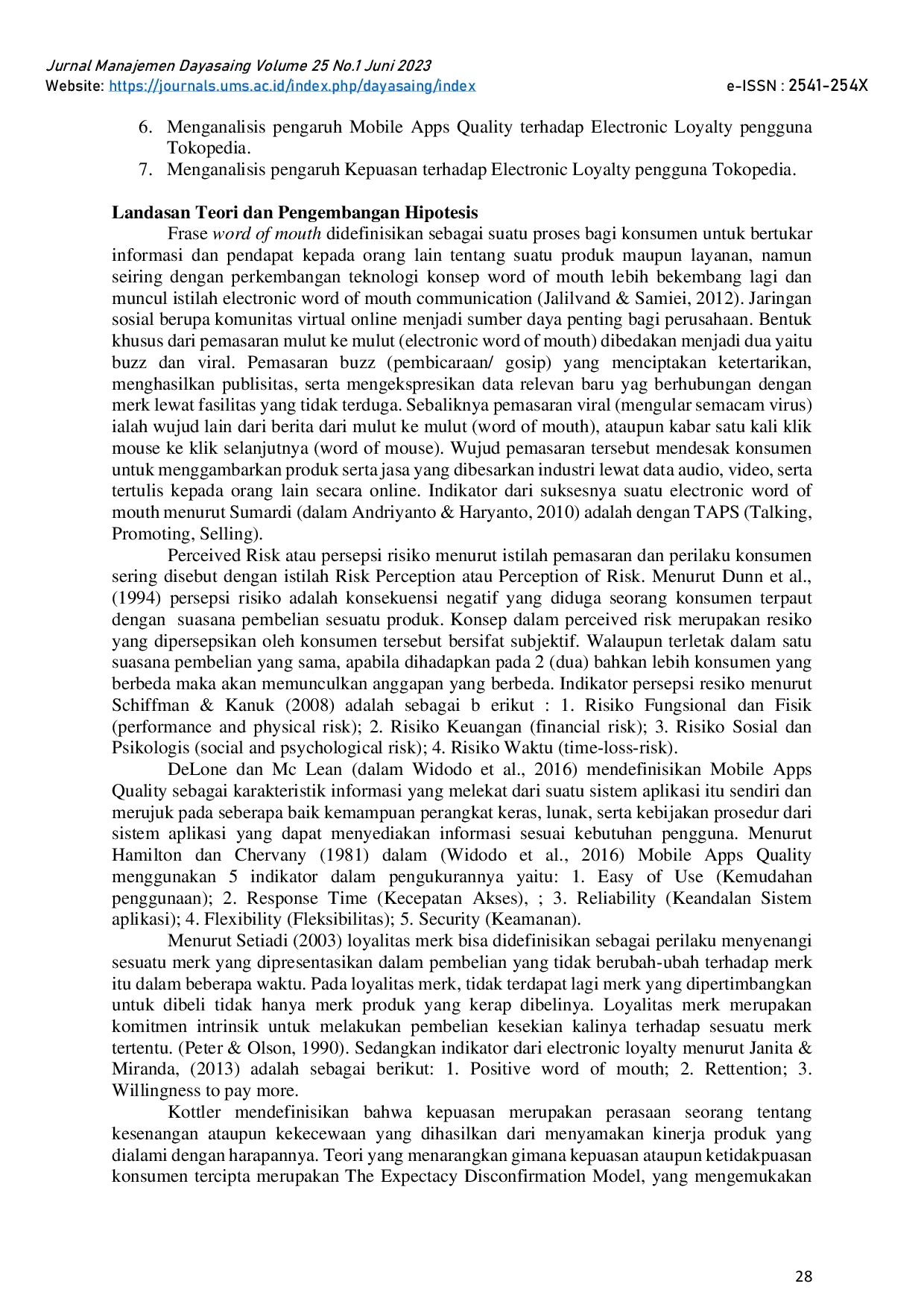 Jurnal Manajemen DayasaingJurnal Manajemen DayasaingPenelitian ini bertujuan untuk menguji teori-teori mengenai pengaruh Electronic Word of Mouth, Perceived Risk, Mobile Apps Quality terhadap kepuasan pengguna Tokopedia di Semarang serta pengaruhnya terhadap Electronic Loyalty. Objek penelitian yaitu mahasiswa pengguna Tokopedia di Seluruh Indonesia dengan batas umur minimal 18 - 26 tahun dan pernah menggunakan Tokopedia minimal 3 kali. Responden yang diolah sebanyak 157 individu dengan teknik analisis (Stuctural Equation Modeling), yang di operasikan menggunakan program Smart PLS. Berdasarkan lima variabel yang diambil kelimanya memiliki dampak positif dan signifikan. Sedangkan untuk kesimpulan akhirnya Electronic Loyalty dapat dicapai melalui meningkatkan Electronic Word of Mouth, Perceived Risk, Mobile Apps Quality dengan mediator Kepuasan.
