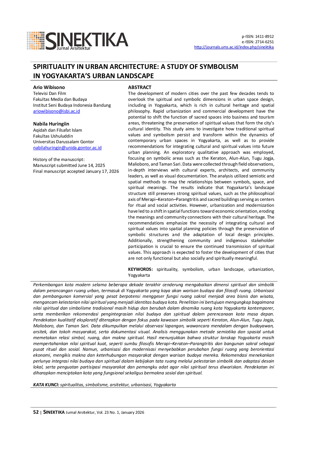 Sinektika: Jurnal ArsitekturSinektika: Jurnal ArsitekturPenelitian ini bertujuan mengungkap bagaimana nilai spiritual dan simbolisme tradisional masih hidup dan berubah dalam dinamika ruang kota Yogyakarta kontemporer, serta memberikan rekomendasi pengintegrasian nilai budaya dan spiritual dalam perencanaan kota masa depan. Pendekatan kualitatif eksploratif diterapkan dengan fokus pada kawasan simbolik seperti Keraton, Alun-Alun, Tugu Jogja, Malioboro, dan Taman Sari. Hasil penelitian menunjukkan bahwa struktur lanskap Yogyakarta masih mempertahankan nilai spiritual kuat, seperti sumbu filosofis Merapi–Keraton–Parangtritis dan bangunan sakral sebagai pusat ritual dan sosial. Namun, urbanisasi dan modernisasi menyebabkan perubahan fungsi ruang yang berorientasi ekonomi, mengikis makna dan keterhubungan masyarakat dengan warisan budaya mereka. Rekomendasi menekankan perlunya integrasi nilai budaya dan spiritual dalam kebijakan tata ruang melalui pelestarian simbolik dan adaptasi desain lokal, serta penguatan partisipasi masyarakat dan pemangku adat agar nilai spiritual terus diwariskan.
