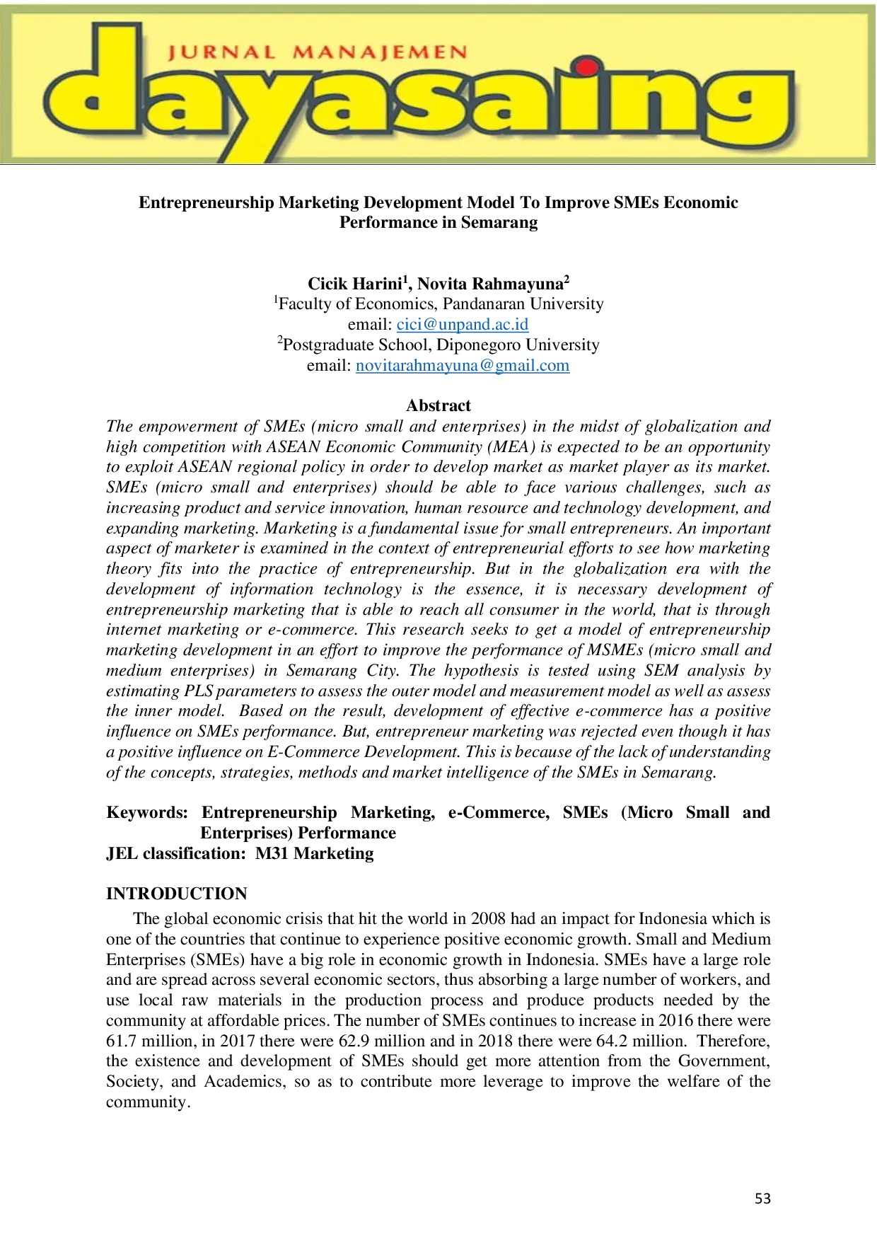 Jurnal Manajemen DayasaingJurnal Manajemen DayasaingPemberdayaan Usaha Mikro Kecil dan Menengah (UMKM) di tengah globalisasi dan persaingan tinggi dengan Masyarakat Ekonomi ASEAN (MEA) diharapkan menjadi kesempatan untuk memanfaatkan kebijakan regional ASEAN agar dapat mengembangkan pasar sebagai pemain pasar. UMKM harus mampu menghadapi berbagai tantangan, seperti peningkatan inovasi produk dan layanan, pengembangan sumber daya manusia dan teknologi, serta perluasan pemasaran. Pemasaran adalah masalah fundamental bagi pengusaha kecil. Aspek penting dari pemasar diperiksa dalam konteks upaya kewirausahaan untuk melihat bagaimana teori pemasaran sesuai dengan praktik kewirausahaan. Namun, di era globalisasi dengan perkembangan teknologi informasi yang menjadi inti, diperlukan pengembangan pemasaran kewirausahaan yang mampu menjangkau semua konsumen di dunia, yaitu melalui pemasaran internet atau e-commerce. Penelitian ini bertujuan untuk mendapatkan model pengembangan pemasaran kewirausahaan dalam upaya meningkatkan kinerja UMKM di Kota Semarang. Hipotesis diuji menggunakan analisis SEM dengan memperkirakan parameter PLS untuk menilai model luar dan model pengukuran serta menilai model dalam. Berdasarkan hasilnya, pengembangan e-commerce yang efektif memiliki pengaruh positif terhadap kinerja UMKM. Namun, pemasaran kewirausahaan ditolak meskipun memiliki pengaruh positif terhadap Pengembangan E-Commerce. Hal ini disebabkan oleh kurangnya pemahaman konsep, strategi, metode, dan intelijen pasar UMKM di Semarang.
