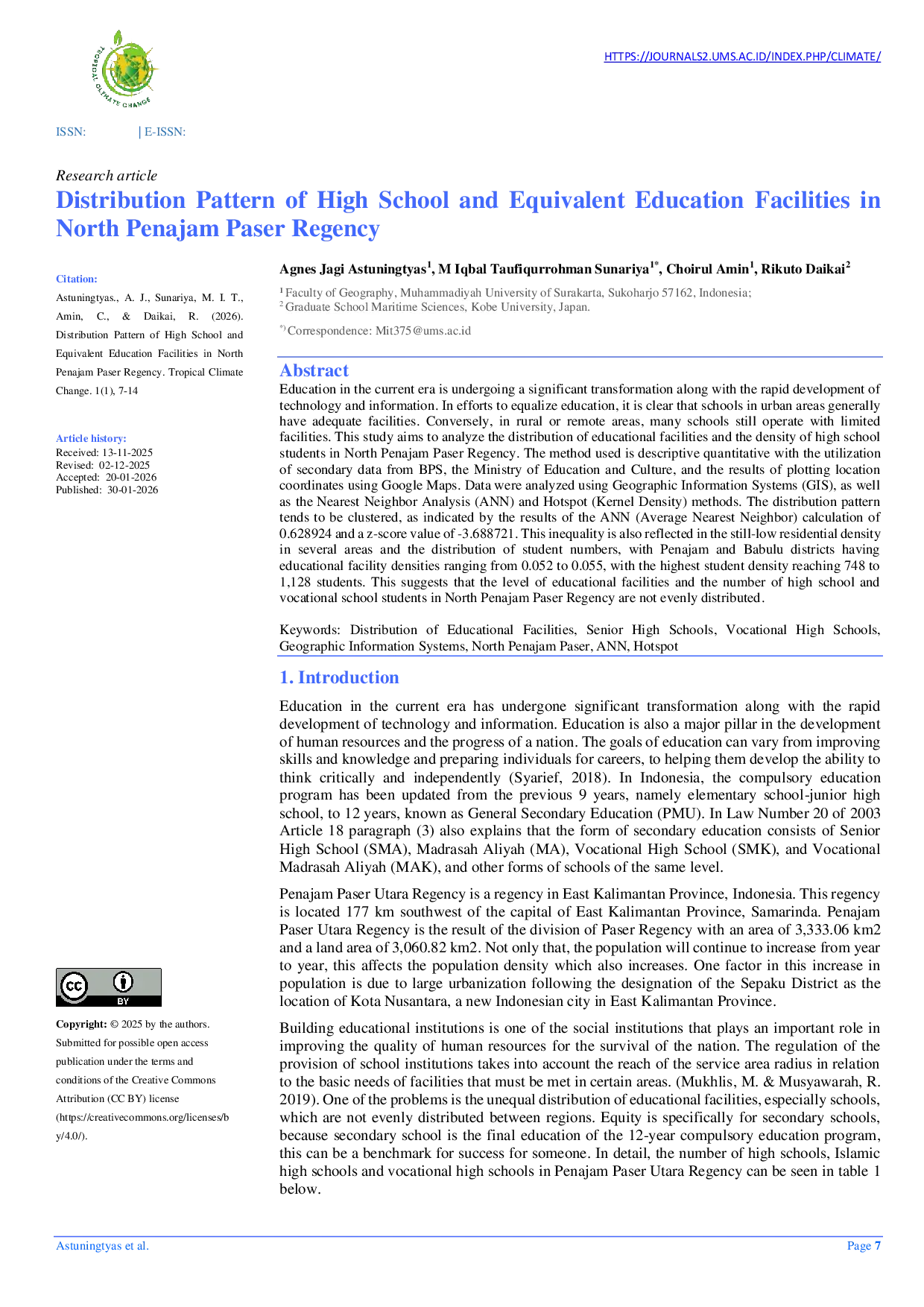 Tropical Climate ChangeTropical Climate ChangePendidikan di era saat ini mengalami perubahan yang signifikan seiring dengan perkembangan teknologi dan informasi yang pesat. Dalam upaya untuk menyamakan pendidikan, jelas bahwa sekolah di daerah perkotaan umumnya memiliki fasilitas yang memadai. Sebaliknya, di daerah pedesaan atau terpencil, banyak sekolah masih beroperasi dengan fasilitas terbatas. Penelitian ini bertujuan untuk menganalisis distribusi fasilitas pendidikan dan kepadatan siswa sekolah menengah di Kabupaten Penajam Paser Utara. Metode yang digunakan adalah deskriptif kuantitatif dengan memanfaatkan data sekunder dari BPS, Kementerian Pendidikan dan Kebudayaan, serta hasil plotting koordinat lokasi menggunakan Google Maps. Data dianalisis menggunakan Sistem Informasi Geografis (SIG), serta metode Nearest Neighbor Analysis (ANN) dan Hotspot (Kernel Density). Pola distribusi cenderung terkumpul, seperti yang ditunjukkan oleh hasil perhitungan ANN (Average Nearest Neighbor) sebesar 0.628924 dan nilai z-score sebesar -3.688721. Ketidaksamaan ini juga tercermin dalam kepadatan penduduk yang masih rendah di beberapa daerah dan distribusi jumlah siswa, dengan Kecamatan Penajam dan Babulu memiliki kepadatan fasilitas pendidikan berkisar antara 0.052 hingga 0.055, dengan kepadatan siswa tertinggi mencapai 748 hingga 1.128 siswa. Hal ini menunjukkan bahwa tingkat fasilitas pendidikan dan jumlah siswa sekolah menengah dan sekolah kejuruan di Kabupaten Penajam Paser Utara tidak terdistribusi secara merata.