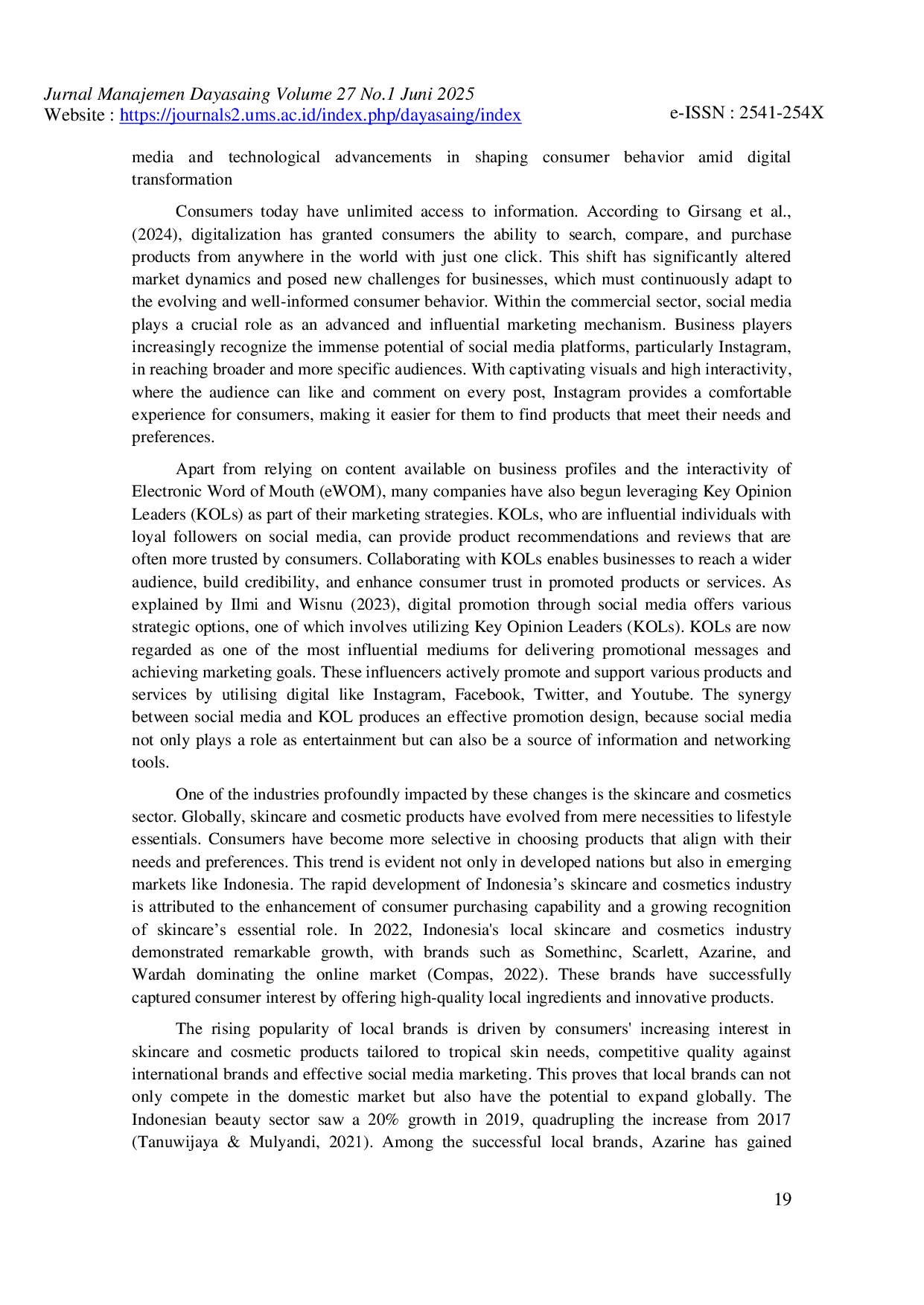 Jurnal Manajemen DayasaingJurnal Manajemen DayasaingSecara global, produk perawatan kulit dan kosmetik tidak hanya menjadi kebutuhan tetapi juga bagian dari gaya hidup. Konsumen semakin selektif dalam memilih produk yang sesuai dengan kebutuhan dan preferensi mereka. Azarine Cosmetic adalah salah satu merek kecantikan lokal yang berhasil menarik perhatian konsumen dengan menawarkan produk yang disesuaikan dengan kondisi kulit dan iklim tropis Indonesia. Pemasaran media sosial, KOL, dan e-WOM memainkan peran penting dalam membentuk perilaku pembelian konsumen, khususnya dalam sektor kecantikan. Penelitian ini bertujuan untuk menganalisis bagaimana pemasaran media sosial, KOL, dan e-WOM mempengaruhi keputusan pembelian produk Azarine. Dengan menggunakan metodologi kuantitatif, penelitian mengumpulkan data survei dari peserta berusia 17 tahun ke atas yang aktif di media sosial, mengikuti produk Azarine, dan familiar dengan KOL yang mendukungnya. Semua 182 responden memenuhi kriteria untuk dimasukkan dalam sampel penelitian. Dataset diolah secara statistik melalui analisis regresi berganda, difasilitasi oleh SPSS versi 29 untuk memastikan interpretasi hasil yang akurat. Temuan menunjukkan bahwa pemasaran media sosial, KOL, dan e-WOM berpengaruh signifikan terhadap keputusan pembelian konsumen, baik secara independen maupun bersama-sama. Selain itu, analisis menunjukkan bahwa faktor-faktor ini menjelaskan 82,8% variasi dalam keputusan pembelian konsumen.