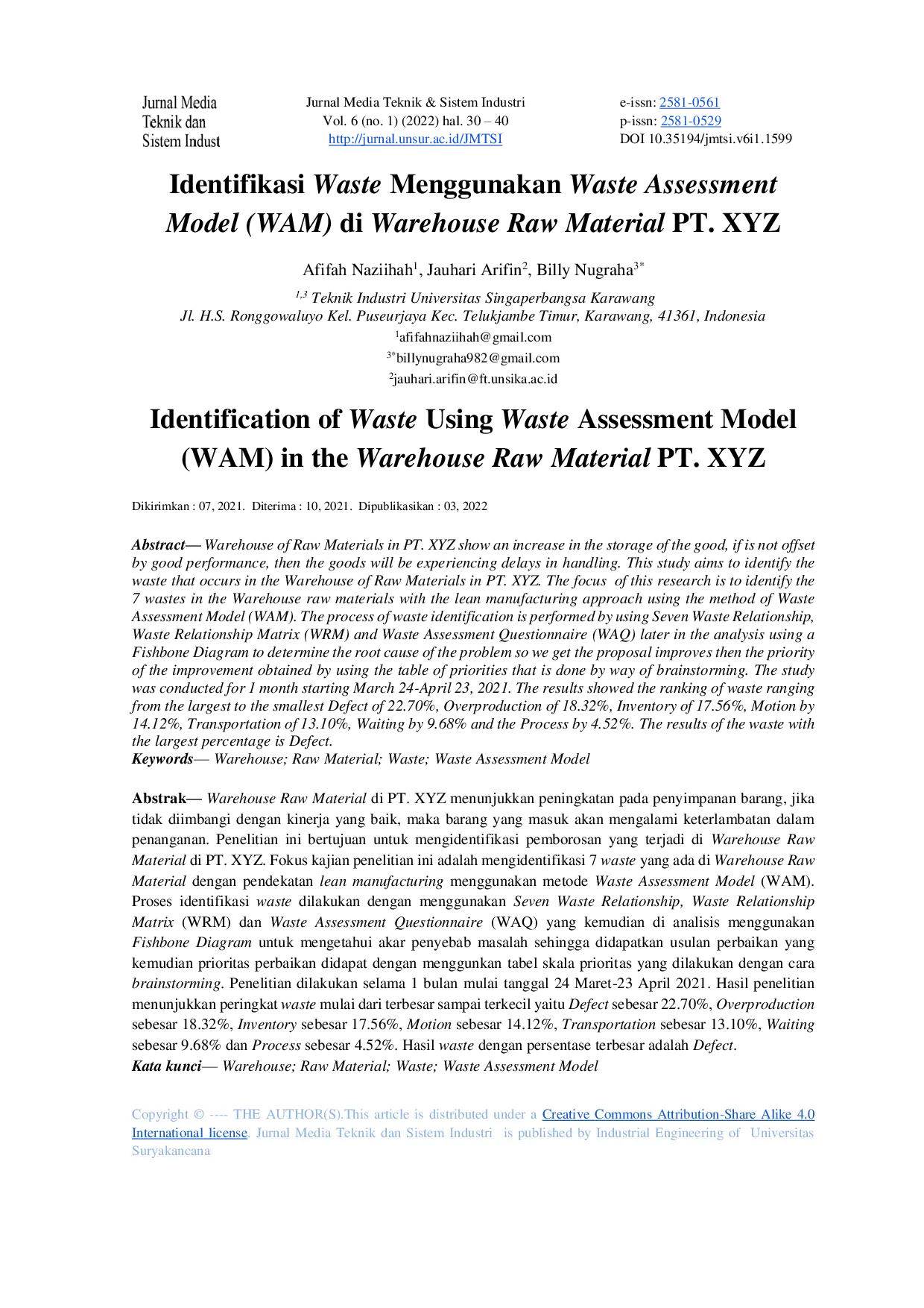 Jurnal Media Teknik dan Sistem IndustriJurnal Media Teknik dan Sistem IndustriWarehouse Raw Material di PT. XYZ menunjukkan peningkatan pada penyimpanan barang, jika tidak diimbangi dengan kinerja yang baik, maka barang yang masuk akan mengalami keterlambatan dalam penanganan. Penelitian ini bertujuan untuk mengidentifikasi pemborosan yang terjadi di Warehouse Raw Material di PT. XYZ. Fokus kajian penelitian ini adalah mengidentifikasi 7 waste yang ada di Warehouse Raw Material dengan pendekatan lean manufacturing menggunakan metode Waste Assessment Model (WAM). Proses identifikasi waste dilakukan dengan menggunakan Seven Waste Relationship, Waste Relationship Matrix (WRM) dan Waste Assessment Questionnaire (WAQ) yang kemudian di analisis menggunakan Fishbone Diagram untuk mengetahui akar penyebab masalah sehingga didapatkan usulan perbaikan yang kemudian prioritas perbaikan didapat dengan menggunakan tabel skala prioritas yang dilakukan dengan cara brainstorming. Penelitian dilakukan selama 1 bulan mulai tanggal 24 Maret-23 April 2021. Hasil penelitian menunjukkan peringkat waste mulai dari terbesar sampai terkecil yaitu Defect sebesar 22.70%, Overproduction sebesar 18.32%, Inventory sebesar 17.56%, Motion sebesar 14.12%, Transportation sebesar 13.10%, Waiting sebesar 9.68% dan Process sebesar 4.52%. Hasil waste dengan persentase terbesar adalah Defect.