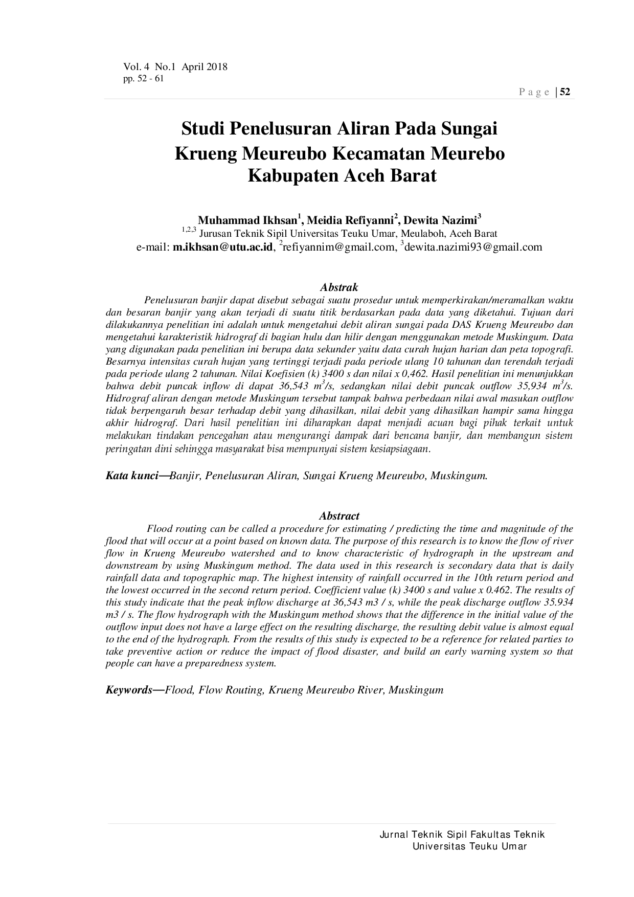 Jurnal Teknik Sipil dan Teknologi KonstruksiJurnal Teknik Sipil dan Teknologi KonstruksiPenelusuran banjir adalah prosedur untuk memperkirakan waktu dan besaran banjir yang akan terjadi di suatu titik berdasarkan data yang diketahui. Tujuan penelitian ini adalah untuk mengetahui debit aliran sungai pada DAS Krueng Meureubo dan karakteristik hidrograf di bagian hulu dan hilir dengan menggunakan metode Muskingum. Data yang digunakan adalah data sekunder berupa data curah hujan harian dan peta topografi. Intensitas curah hujan tertinggi terjadi pada periode ulang 10 tahunan dan terendah pada periode ulang 2 tahunan. Nilai Koefisien (k) adalah 3400 s dan nilai x adalah 0,462. Hasil penelitian menunjukkan bahwa debit puncak inflow adalah 36,543 m3/s, sedangkan debit puncak outflow adalah 35,934 m3/s. Hidrograf aliran dengan metode Muskingum menunjukkan bahwa perbedaan nilai awal masukan outflow tidak berpengaruh besar terhadap debit yang dihasilkan, nilai debit yang dihasilkan hampir sama hingga akhir hidrograf. Penelitian ini diharapkan dapat menjadi acuan bagi pihak terkait untuk melakukan tindakan pencegahan atau mengurangi dampak banjir, dan membangun sistem peringatan dini.
