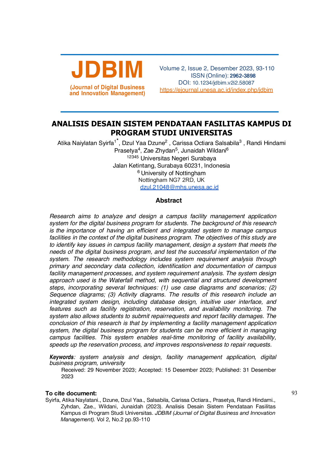 Journal of Digital Business and Innovation ManagementJournal of Digital Business and Innovation ManagementPenelitian ini bertujuan untuk menganalisis dan mendesain sistem aplikasi pendataan fasilitas kampus untuk program bisnis digital bagi mahasiswa. Latar belakang penelitian ini adalah pentingnya memiliki sistem yang efisien dan terintegrasi untuk mengelola fasilitas kampus dalam konteks program bisnis digital. Tujuan penelitian ini adalah mengidentifikasi isu-isu utama dalam pengelolaan fasilitas kampus, merancang sistem yang sesuai dengan kebutuhan program bisnis digital, dan menguji keberhasilan implementasi sistem. Metode penelitian yang digunakan meliputi analisis kebutuhan sistem melalui pengumpulan data primer dan sekunder, identifikasi dan dokumentasi proses pengelolaan fasilitas kampus, serta analisis persyaratan sistem. Pendekatan desain sistem yang digunakan adalah metode Waterfall, dengan langkah-langkah pengembangan yang berurutan dan terstruktur, dengan melalui beberapa teknik: (1) Use case diagram dan skenario; (2) Sequence diagram; (3) Activity diagram. Hasil penelitian ini mencakup desain sistem yang terintegrasi, meliputi perancangan basis data, antarmuka pengguna yang intuitif, dan fitur-fitur seperti pendataan fasilitas, pemesanan, dan pemantauan ketersediaan. Sistem juga memungkinkan mahasiswa untuk mengajukan permintaan perbaikan dan pelaporan kerusakan fasilitas. Kesimpulan dari penelitian ini adalah bahwa dengan menerapkan sistem aplikasi pendataan fasilitas, program bisnis digital bagi mahasiswa dapat lebih efisien dalam mengelola fasilitas kampus. Sistem ini memungkinkan pemantauan real-time terhadap ketersediaan fasilitas, mempercepat proses pemesanan, dan meningkatkan responsivitas terhadap permintaan perbaikan.