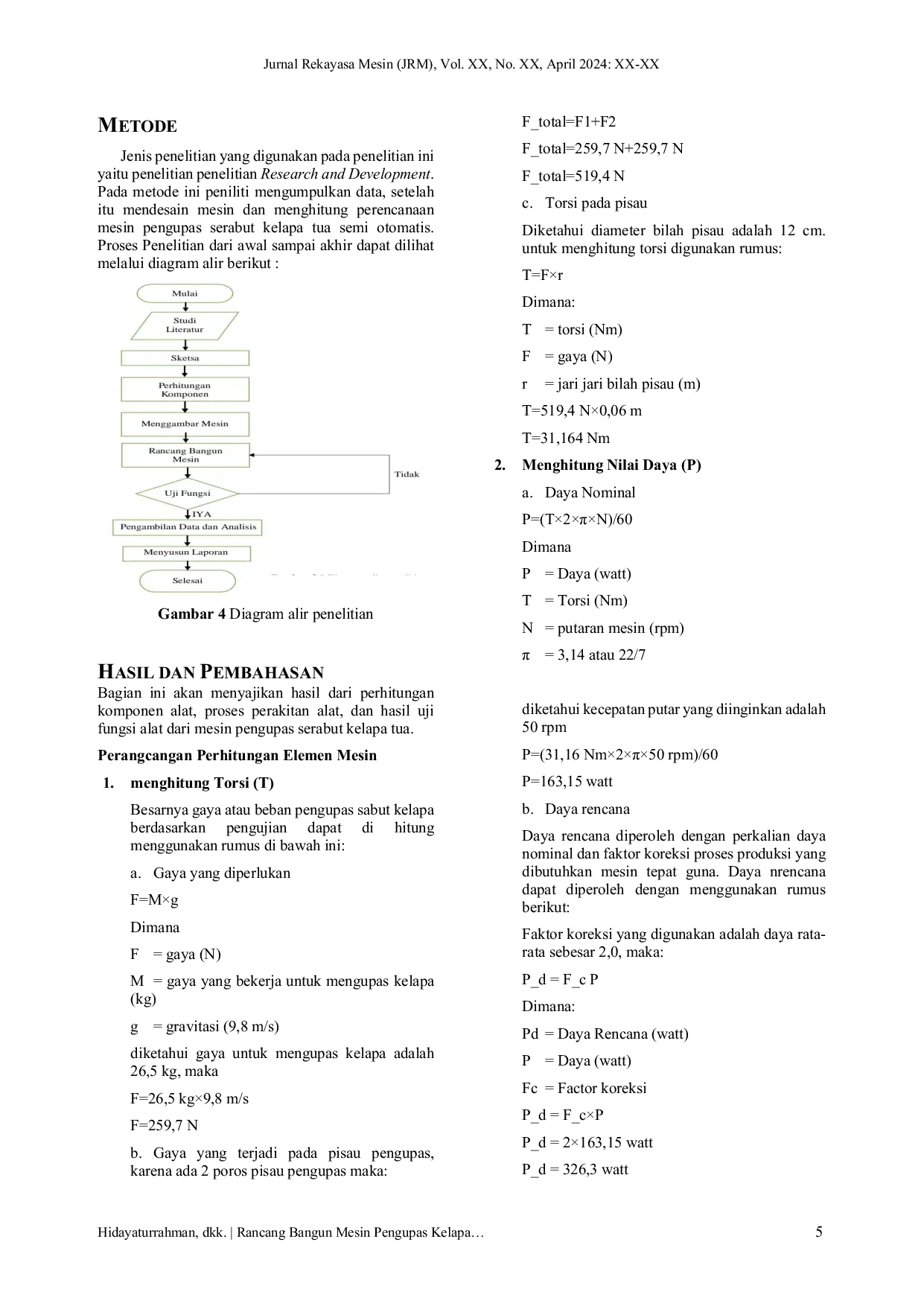 Jurnal Rekayasa MesinJurnal Rekayasa MesinProses pengupasan serabut kelapa tua umumnya masih menggunakan cara manual dengan menggunakan linggis dan parang sehingga membutuhkan banyak tenaga manusia. Disisi lain mengupas serabut kelapa tua menggunakan linggis dan parang membutuhkan waktu yang lama. Oleh karena itu, dirancang dan dibangun Mesin Pengupas Serabut Kelapa Tua Semi Otomatis yang bertujuan untuk menghemat biaya operasional. Mesin ini merupakan solusi inovatif dalam industri pengolahan kelapa, dirancang untuk efisiensi dalam mengupas serabut kelapa tua dengan menggabungkan elemen otomatis dan kontrol manual. Mesin ini menggunakan motor diesel 3600 Rpm dan gearbox 1:30, dengan dimensi rangka 105 cm x 50 cm x 110 cm, 2 roller pengupas, dan 1 kipas penekan karet. Metode penelitian meliputi perhitungan perencanaan dan desain komponen seperti Torsi, Daya, Motor Diesel, Perhitungan Transmisi, Panjang Vanblet, dan Panjang Rantai. Uji fungsi dilakukan sebanyak 9 kali, menghasilkan Torsi T= 31,164 Nm, Daya P= 163,15 Watt, Motor Diesel T= 925,71 Nm, Perhitungan Transmisi Z_2=35 pitch, Panjang Vanbelt L=84,5 cm, Panjang Rantai Lā86 pitch. Hasil pengupasan terbaik diperoleh pada kelapa tua seberat 1 kg dengan waktu 4 detik.
