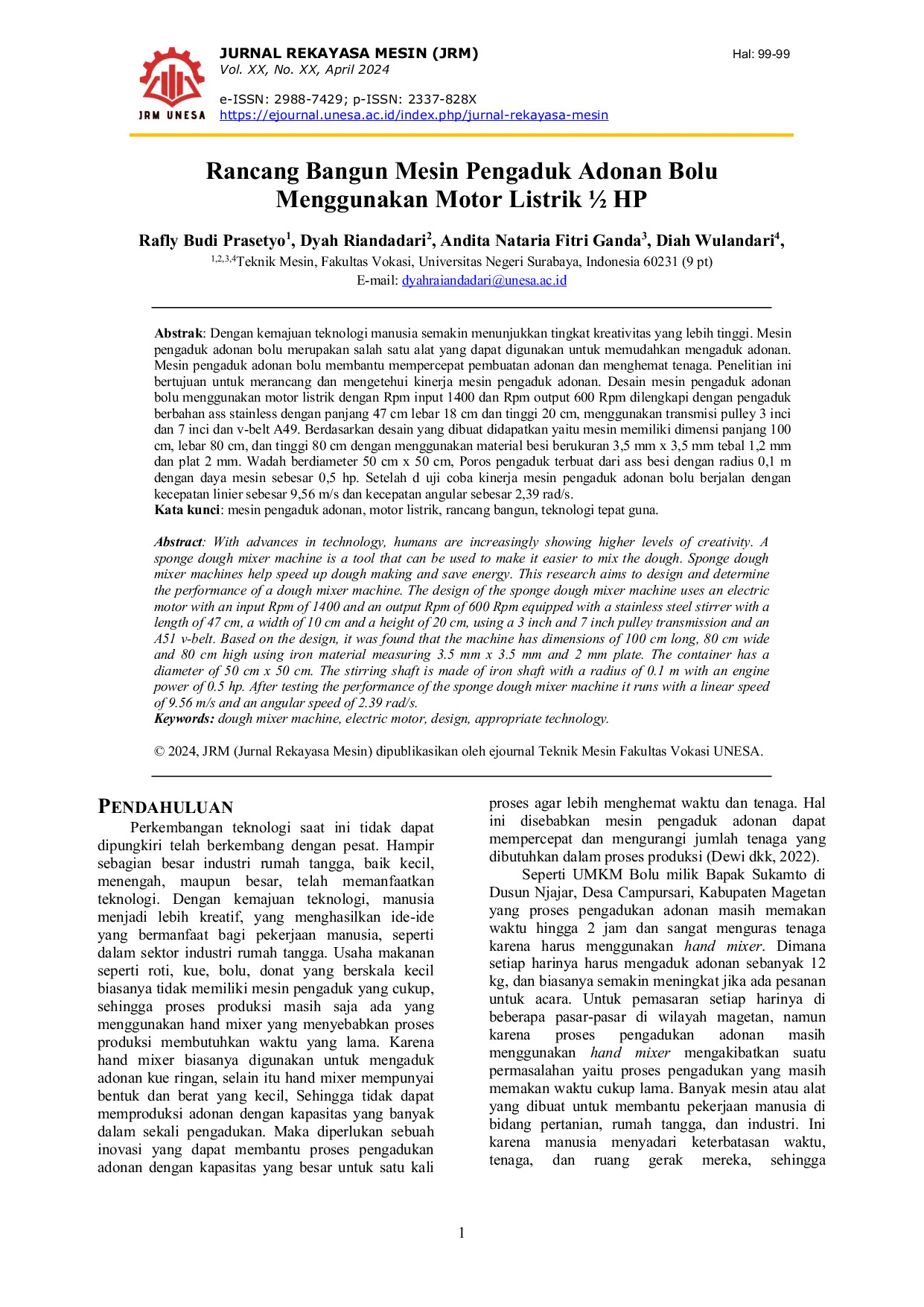 Jurnal Rekayasa MesinJurnal Rekayasa MesinDengan kemajuan teknologi manusia semakin menunjukkan tingkat kreativitas yang lebih tinggi. Mesin pengaduk adonan bolu merupakan salah satu alat yang dapat digunakan untuk memudahkan mengaduk adonan. Mesin pengaduk adonan bolu membantu mempercepat pembuatan adonan dan menghemat tenaga. Penelitian ini bertujuan untuk merancang dan mengetehui kinerja mesin pengaduk adonan. Desain mesin pengaduk adonan bolu menggunakan motor listrik dengan Rpm input 1400 dan Rpm output 600 Rpm dilengkapi dengan pengaduk berbahan ass stainless dengan panjang 47 cm lebar 18 cm dan tinggi 20 cm, menggunakan transmisi pulley 3 inci dan 7 inci dan v-belt A49. Berdasarkan desain yang dibuat didapatkan yaitu mesin memiliki dimensi panjang 100 cm, lebar 80 cm, dan tinggi 80 cm dengan menggunakan material besi berukuran 3,5 mm x 3,5 mm tebal 1,2 mm dan plat 2 mm. Wadah berdiameter 50 cm x 50 cm, Poros pengaduk terbuat dari ass besi dengan radius 0,1 m dengan daya mesin sebesar 0,5 hp. Setelah d uji coba kinerja mesin pengaduk adonan bolu berjalan dengan kecepatan linier sebesar 9,56 m/s dan kecepatan angular sebesar 2,39 rad/s.