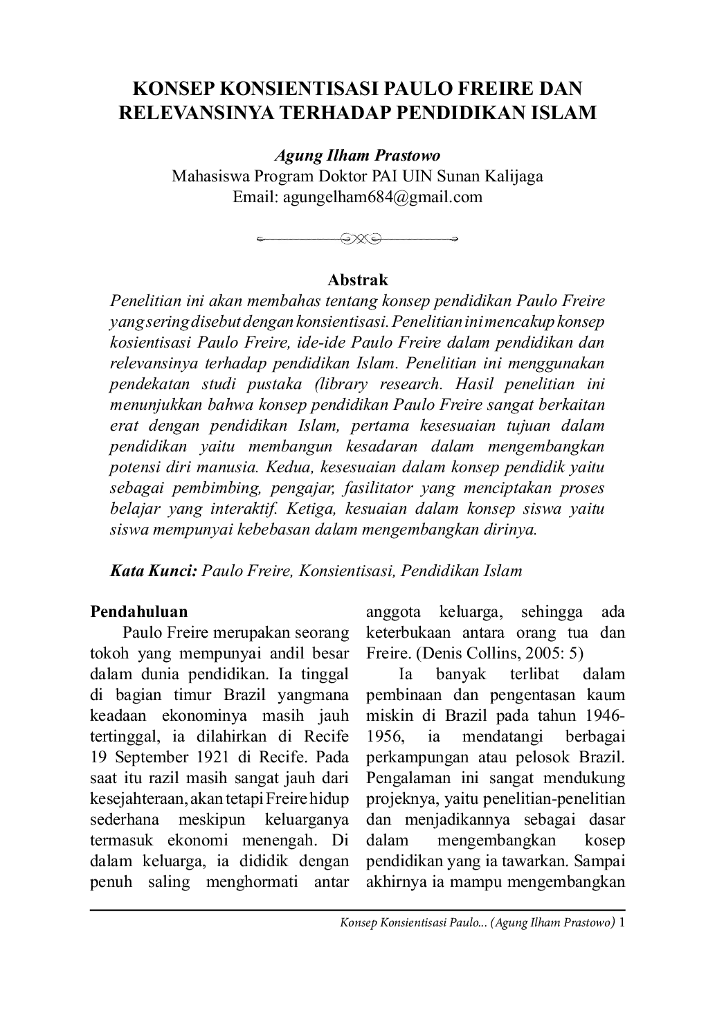 Suhuf: International Journal of Islamic StudiesSuhuf: International Journal of Islamic StudiesPenelitian ini membahas tentang konsep pendidikan Paulo Freire yang sering disebut dengan konsientisasi. Penelitian ini mencakup konsep kosientisasi Paulo Freire, ide-ide Paulo Freire dalam pendidikan dan relevansinya terhadap pendidikan Islam. Penelitian ini menggunakan pendekatan studi pustaka. Hasil penelitian ini menunjukkan bahwa konsep pendidikan Paulo Freire sangat berkaitan erat dengan pendidikan Islam, pertama kesesuaian tujuan dalam pendidikan yaitu membangun kesadaran dalam mengembangkan potensi diri manusia. Kedua, kesesuaian dalam konsep pendidik yaitu sebagai pembimbing, pengajar, fasilitator yang menciptakan proses belajar yang interaktif. Ketiga, kesuaian dalam konsep siswa yaitu siswa mempunyai kebebasan dalam mengembangkan dirinya.