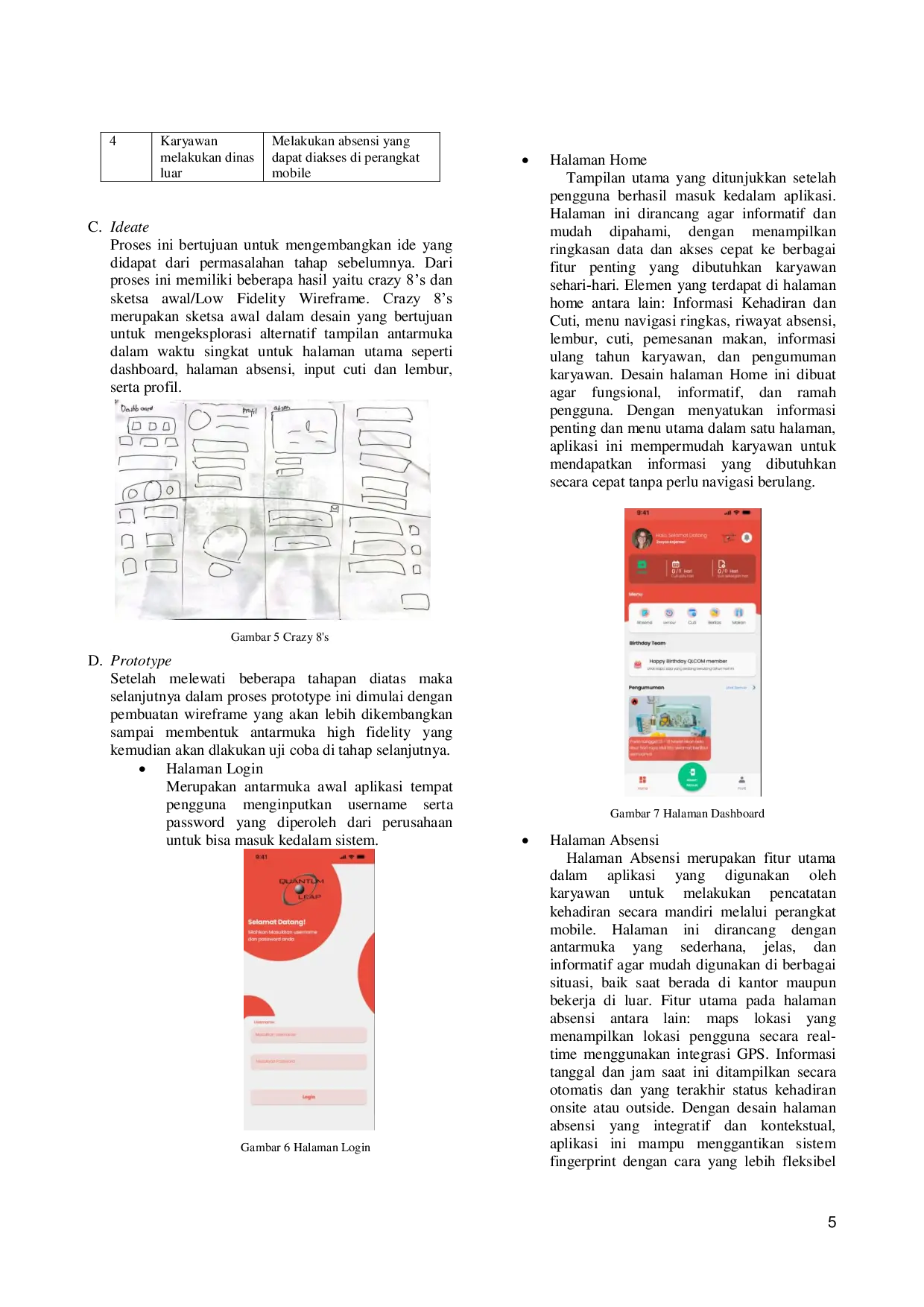 Jurnal Manajemen InformatikaJurnal Manajemen InformatikaProses absensi di PT QLCOM Solusi Bisnis saat ini masih menggunakan fingerprint yang mengharuskan kehadiran fisik, sehingga menyusahkan bagi karyawan yang melakukan dinas luar ataupun WFH. Selain itu, pengajuan cuti dan lembur dilakukan melalui sistem terpisah serta pengelolaan data karyawan diinputkan dengan cara manual. Penelitian ini bertujuan untuk merancang antarmuka aplikasi absensi mobile yang fleksibel, dan berfokus pada kebutuhan user dengan metode Design Thinking. Tahapan penelitian meliputi analisis masalah, Perumusan How Might We (HMW), pencarian ide solusi, serta pengujian prototipe menggunakan metode System Usability Scale (SUS). Hasilnya berupa prototipe aplikasi absensi mobile yang memiliki fitur utama pencatatan kehadiran berbasis lokasi, pengajuan cuti dan lembur yang terintegrasi, notifikasi otomatis, serta pengelolaan data pribadi oleh karyawan. Pada uji coba menunjukkan aplikasi ini mampu meningkatkan kenyamanan dan efisiensi dalam proses absensi maupun administrasi personal lainnya. Prototype dirancang menggunakan Figma yang memungkinkan kolaborasi secara daring dan real-time.