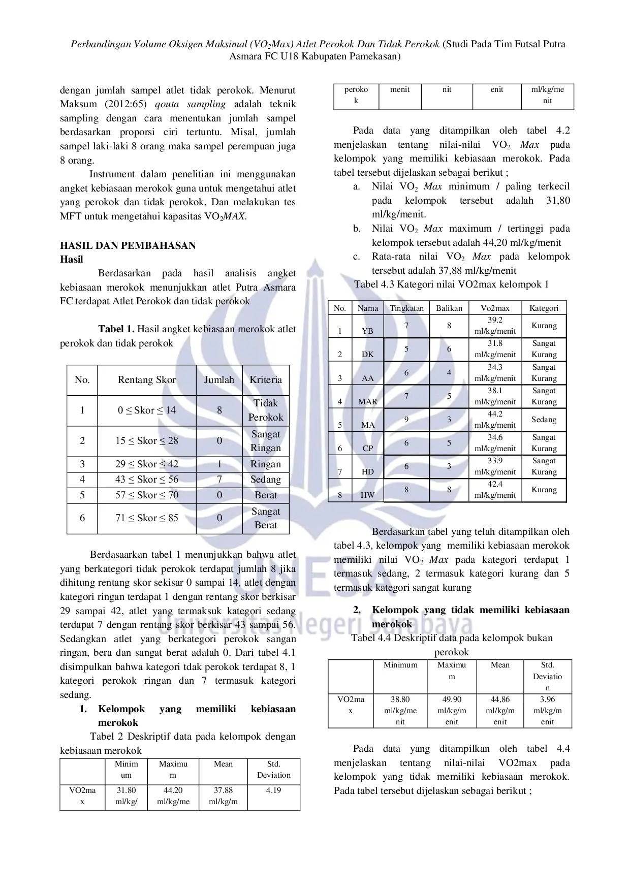 Rata-rata volume oksigen maksimal (VO2 Max) atlet perokok pada pemain futsal Putra Asmara FC U18 adalah 37,88 ml/kg/menit yang termasuk dalam kategori kurang.Rata-rata volume oksigen maksimal (VO2 Max) atlet tidak perokok adalah 44,90 ml/kg/menit yang termasuk dalam kategori sedang.Terdapat perbedaan signifikan pada volume oksigen maksimal (VO2 Max) antara atlet perokok dan tidak perokok pada pemain futsal Putra Asmara FC U18.