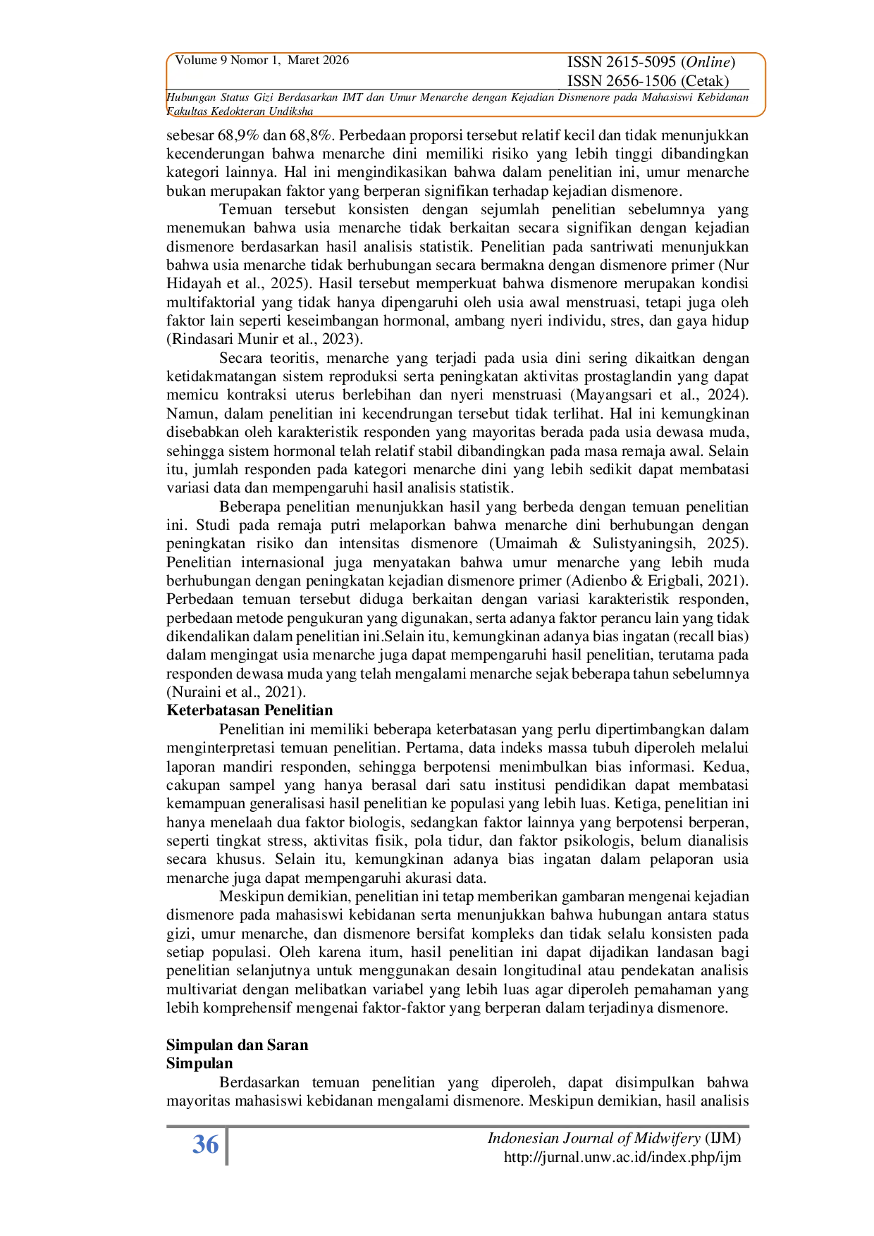 Indonesian Journal of Midwifery (IJM)Indonesian Journal of Midwifery (IJM)Dismenore merupakan keluhan nyeri yang sering muncul selama menstruasi pada perempuan usia reproduktif dan dapat berdampak pada aktivitas sehari-hari, termasuk kegiatan akademik pada mahasiswa. Status gizi serta umur menarche merupakan faktor biologis yang secara teoritis dikaitkan dengan terjadinya dismenore, meskipun hasil penelitian terdahulu masih memperlihatkan temuan yang beragam. Penelitian ini dilakukan untuk mengetahui hubungan antara status gizi dan umur menarche dengan kejadian dismenore pada mahasiswi kebidanan undiksha. Penelitian ini menggunakan pendekatan kuantitatif dengan rancangan survei analitik melalui desain potong lintang (cross sectional). Populasi penelitian mencakup seluruh mahasiswi jurusan Kebidanan angkatan 2023, 2024, dan 2025 yang berstatus aktif secara akademik. Teknik pengambilan sampel yang digunakan adalah total sampling. Dari total 177 mahasiswi yang menjadi populasi penelitian, sebanyak 159 mahasiswi memiliki data lengkap dan dianalisis dalam penelitian ini. Pengumpulan data dilakukan menggunakan kuesioner terstruktur yang disusun oleh peneliti sesuai dengan variabel penelitian, meliputi status gizi, usia menarche, dan kejadian dismenore, yang disebarkan secara daring melalui Google Form. Status gizi ditentukan berdasarkan indeks massa tubuh (IMT) yang dihitung dari data berat badan dan tinggi badan yang dilaporkan sendiri oleh responden, dengan upaya meminimalkan potensi bias melalui pemberian petunjuk pengisian yang jelas dan pemeriksaan kelogisan data sebelum analisis. Nilai IMT kemudian dikategorikan menjadi status gizi kurus, normal, dan lebih berdasarkan kriteria World Health Organization (WHO). Analisis data dilakukan secara univariat menggunakan statistik deskriptif dan secara bivariat menggunakan uji Chi-square. Hasil penelitian memperlihatkan bahwa sebagian besar responden mengalami dismenore (68,6%). Mayoritas responden memiliki status gizi normal (54,1%) dan mengalami menarche pada rentang usia normal (84,9%). Hasil uji chi-square tidak ditemukan hubungan yang bermakna antara status gizi dengan kejadian dismenore (p = 0,547). Demikian pula, umur menarche tidak menunjukkan hubungan yang bermakna dengan kejadian dismenore (p = 0,931). Berdasarkan temuan tersebut, dapat disimpulkan bahwa status gizi dan umur menarche tidak berkaitan secara signifikan dengan kejadian dismenore pada mahasiswi kebidanan. Promosi kesehatan reproduksi di lingkungan pendidikan perlu diarahkan pada pendekatan yang lebih komprehensif, tidak hanya menekankan faktor biologis tetapi juga faktor psikologis dan gaya hidup sehat. Mahasiswi kebidanan disarankan untuk menerapkan pola hidup sehat, meningkatkan aktivitas fisik, serta mengelola stres sebagai upaya non farmakologis dalam mengurangi keluhan dismenore. Penelitian selanjutnya diharapkan dapat mengkaji faktor lain yang berpotensi berhubungan dengan dismenore menggunakan desain penelitian yang lebih luas atau analisis multivariat.