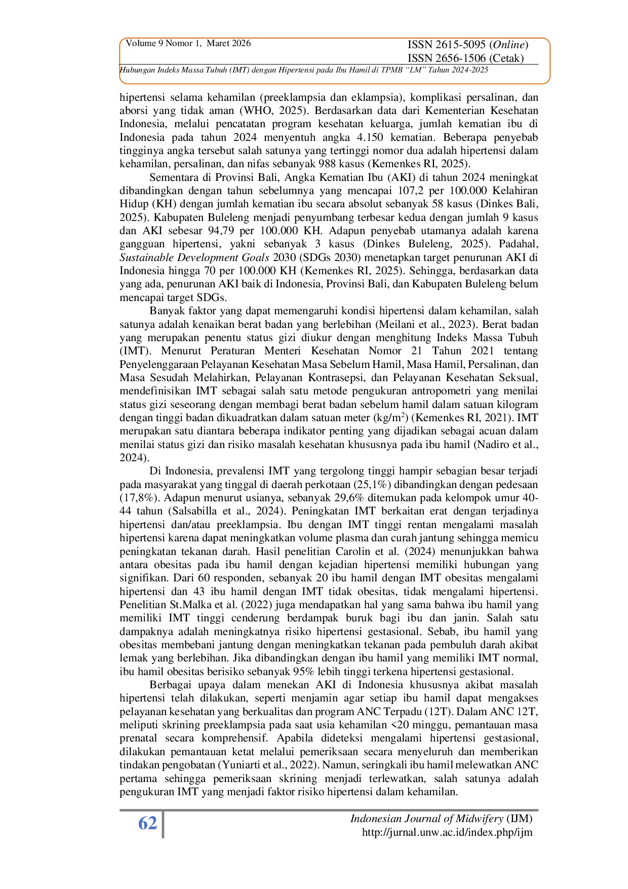 - INDEKS MASSA TUBUH (IMT) DENGAN KEJADIAN PREEKLAMPSIA PADA IBU HAMIL | Jurnal Sains Kebidanan. indeks... doi.org/10.31983/jsk.v5i1.9696INDEKS MASSA TUBUH IMT DENGAN KEJADIAN PREEKLAMPSIA PADA IBU HAMIL Jurnal Sains Kebidanan indeks doi 10 31983 jsk v5i1 9696