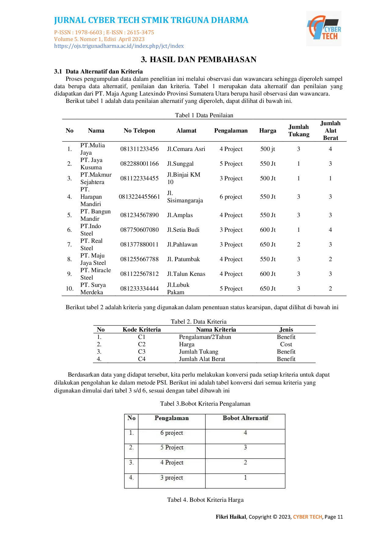 Jurnal Cyber TechJurnal Cyber TechSistem Pendukung Keputusan sangat diperlukan untuk proses pengambilan keputusan, Pada PT. Maja Agung Latexindo perusahaan ingin membangun sebuah gudang untuk mealokasikan hasil produksi dan kebutuhan lainnya. Maka diperlukan seorang kontraktor baja untuk membangun gudang tersebut. Dengan ini deperlukan sebuah proses Sistem Pendukung Keputusan dengan mengadopsi metode Preference Selection Index untuk hasil keputusan yang lebih baik. Oleh karena itu maka dibuatlah sebuah Sistem Pendukung Keputusan untuk merekrut Kontraktor Baja di PT.Maja Agung Latexindo yang berkualitas.Oleh karena itu diperlukan adanya Sistem Pendukung Keputusan merekrut Kontraktor Baja di PT.Maja Agung Latexindo menggunakan metode Preference Selection Index. Dengan adanya sistem tersebut diharapkan kinerja dan waktu dalam pengambilan keputusan perekrutan Kontraktor Baja menjadi efektif dan efisien baik dari segi kecepatan dan dalam mengambil keputusan.Hasil program ini menunjukkan bahwa sistem yang dibangun dengan berbasis desktop dapat mempermudah instansi dalam melakukan pengambilan keputusan perekrutan Kontraktor baja,dengan sistem ini instansi dapat mengambil keputusan menggunakan metode Preference Selection Index.