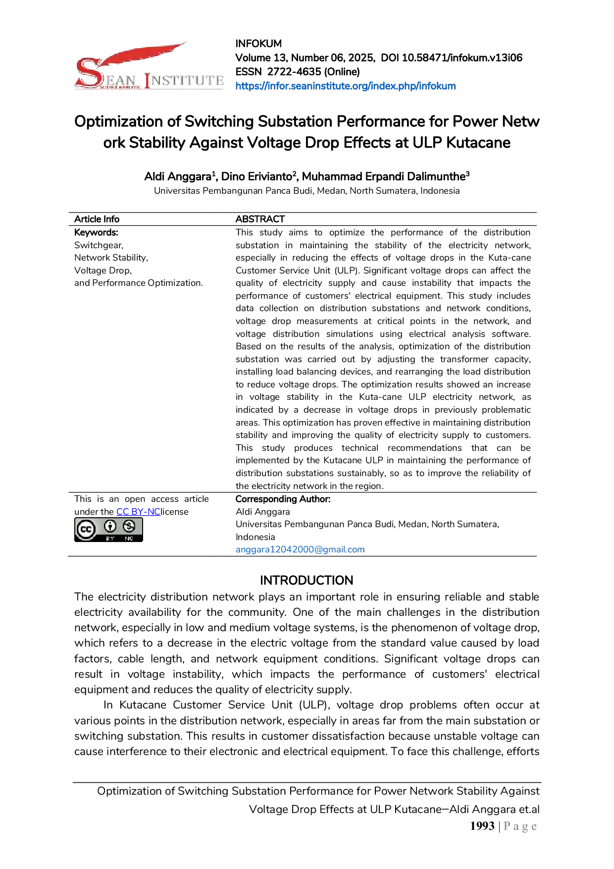 Optimasi kinerja gardu hubung (switching substation) di ULP Kutacane memberikan dampak signifikan terhadap peningkatan stabilitas jaringan kelistrikan, khususnya dalam mengurangi efek penurunan tegangan.Strategi optimasi seperti penyesuaian tap changer trafo, penyeimbangan beban fase, dan pemasangan kapasitor bank terbukti efektif menurunkan penurunan tegangan hingga berada dalam batas standar SPLN.Setelah optimasi, nilai tegangan di berbagai titik kritis meningkat dari rata-rata 195 V menjadi 218 V dalam sistem 220 V, efisiensi distribusi daya meningkat, rugi-rugi daya aktif berkurang, dan keandalan pasokan listrik ke pelanggan membaik.