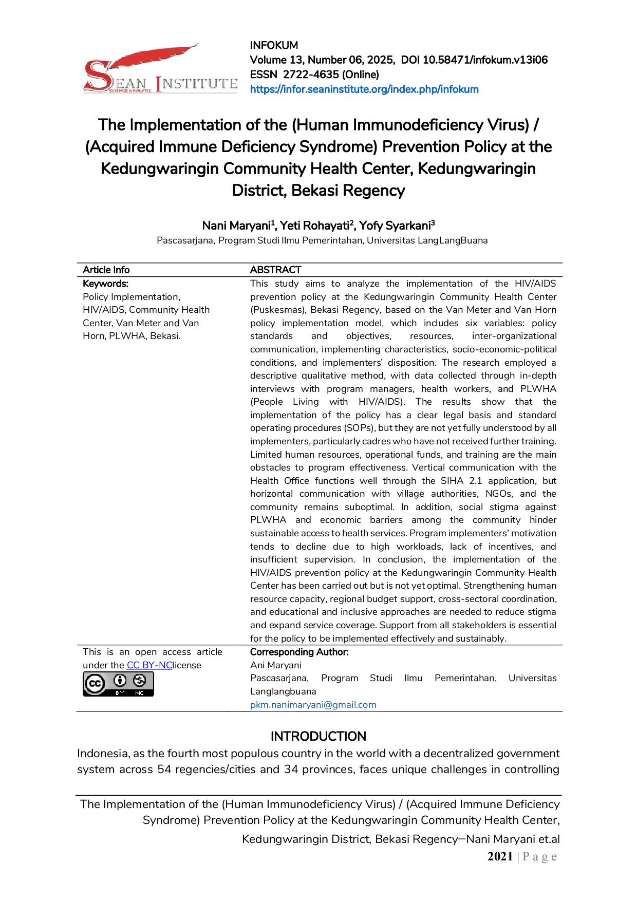 INFOKUMINFOKUMThis study aims to analyze the implementation of the HIV/AIDS prevention policy at the Kedungwaringin Community Health Center (Puskesmas), Bekasi Regency, based on the Van Meter and Van Horn policy implementation model, which includes six variables: policy standards and objectives, resources, inter-organizational communication, implementing characteristics, socio-economic-political conditions, and implementers disposition. The research employed a descriptive qualitative method, with data collected through in-depth interviews with program managers, health workers, and PLWHA (People Living with HIV/AIDS). The implementation of the policy has a clear legal basis and standard operating procedures (SOPs), but they are not yet fully understood by all implementers, particularly cadres who have not received further training. Limited human resources, operational funds, and training are the main obstacles to program effectiveness. Vertical communication with the Health Office functions well through the SIHA 2.1 application, but horizontal communication with village authorities, NGOs, and the community remains suboptimal. In addition, social stigma against PLWHA and economic barriers among the community hinder sustainable access to health services. Program implementers motivation tends to decline due to high workloads, lack of incentives, and insufficient supervision. In conclusion, the implementation of the HIV/AIDS prevention policy at the Kedungwaringin Community Health Center has been carried out but is not yet optimal. Strengthening human resource capacity, regional budget support, cross-sectoral coordination, and educational and inclusive approaches are needed to reduce stigma and expand service coverage. Support from all stakeholders is essential for the policy to be implemented effectively and sustainably.