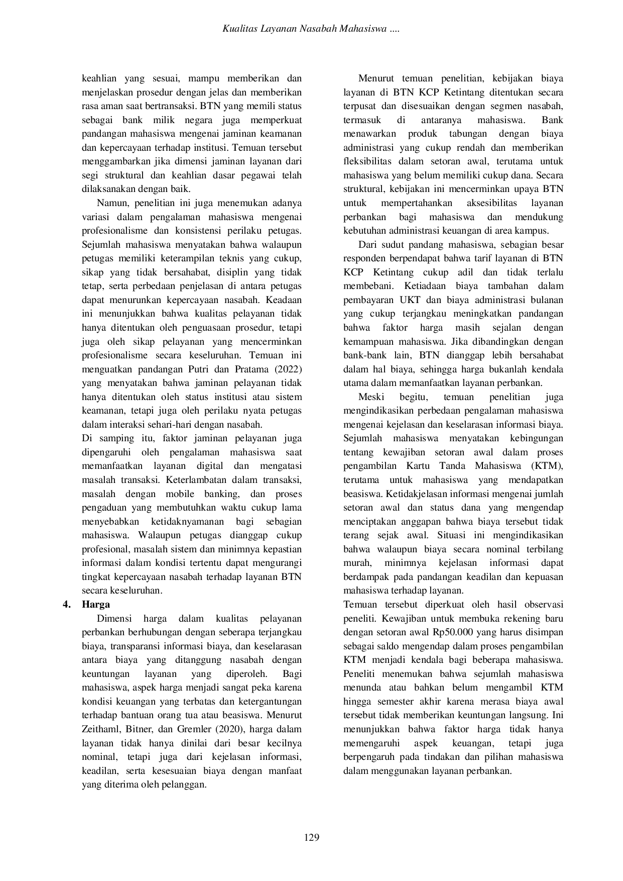 PublikaPublikaKualitas layanan perbankan menjadi aspek penting dalam membangun kepuasan dan loyalitas nasabah, khususnya mahasiswa yang memiliki karakteristik dan kebutuhan unik. Penelitian ini bertujuan untuk menganalisis dan mendeskripsikan kualitas layanan yang diberikan oleh Bank Tabungan Negara (BTN) Kantor Cabang Pembantu Ketintang kepada mahasiswa Universitas Negeri Surabaya. Penelitian ini menggunakan pendekatan kualitatif deskriptif dengan lima dimensi kualitas pelayanan menurut Nurdin (2019), yaitu sarana pelayanan, keandalan, jaminan, harga, dan empati. Data dikumpulkan melalui wawancara mendalam dengan mahasiswa UNESA, pihak manajemen bank, dan petugas layanan, serta didukung oleh observasi lapangan dan studi dokumentasi. Hasil penelitian menunjukkan bahwa kualitas layanan BTN KCP Ketintang secara umum sudah cukup baik, namun masih terdapat beberapa aspek yang perlu ditingkatkan. Pada dimensi sarana pelayanan, fasilitas dasar telah tersedia namun masih terdapat keterbatasan kapasitas ruang tunggu dan keandalan mesin ATM, terutama saat lonjakan pengunjung. Dimensi keandalan menunjukkan pelayanan yang terstruktur sesuai SOP, namun ditemukan inkonsistensi prosedur dan informasi antar petugas. Dimensi jaminan telah terpenuhi dari segi keamanan institusional, namun profesionalitas petugas belum sepenuhnya konsisten. Dimensi harga dinilai terjangkau, namun transparansi informasi biaya masih perlu ditingkatkan. Dimensi empati menunjukkan sikap ramah petugas, namun belum konsisten terutama pada kondisi pelayanan padat. Penelitian ini merekomendasikan perlunya peningkatan fasilitas inklusif, konsistensi prosedur, transparansi informasi, serta penguatan profesionalisme dan empati petugas untuk meningkatkan kualitas layanan secara menyeluruh.