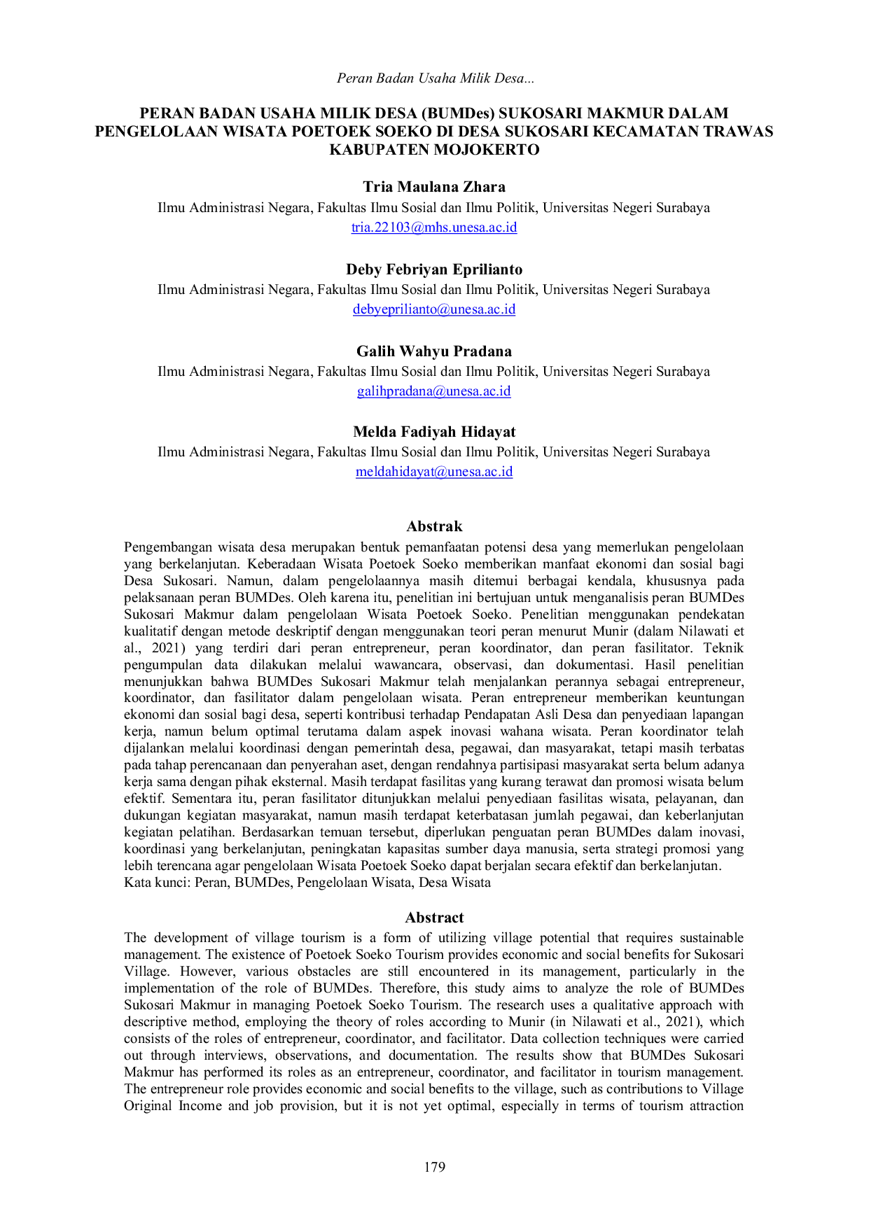 PublikaPublikaPengembangan wisata desa merupakan bentuk pemanfaatan potensi desa yang memerlukan pengelolaan yang berkelanjutan. Keberadaan Wisata Poetoek Soeko memberikan manfaat ekonomi dan sosial bagi Desa Sukosari. Namun, dalam pengelolaannya masih ditemui berbagai kendala, khususnya pada pelaksanaan peran BUMDes. Oleh karena itu, penelitian ini bertujuan untuk menganalisis peran BUMDes Sukosari Makmur dalam pengelolaan Wisata Poetoek Soeko. Penelitian menggunakan pendekatan kualitatif dengan metode deskriptif dengan menggunakan teori peran menurut Munir (dalam Nilawati et al., 2021) yang terdiri dari peran entrepreneur, peran koordinator, dan peran fasilitator. Teknik pengumpulan data dilakukan melalui wawancara, observasi, dan dokumentasi. Hasil penelitian menunjukkan bahwa BUMDes Sukosari Makmur telah menjalankan perannya sebagai entrepreneur, koordinator, dan fasilitator dalam pengelolaan wisata. Peran entrepreneur memberikan keuntungan ekonomi dan sosial bagi desa, seperti kontribusi terhadap Pendapatan Asli Desa dan penyediaan lapangan kerja, namun belum optimal terutama dalam aspek inovasi wahana wisata. Peran koordinator telah dijalankan melalui koordinasi dengan pemerintah desa, pegawai, dan masyarakat, tetapi masih terbatas pada tahap perencanaan dan penyerahan aset, dengan rendahnya partisipasi masyarakat serta belum adanya kerja sama dengan pihak eksternal. Masih terdapat fasilitas yang kurang terawat dan promosi wisata belum efektif. Sementara itu, peran fasilitator ditunjukkan melalui penyediaan fasilitas wisata, pelayanan, dan dukungan kegiatan masyarakat, namun masih terdapat keterbatasan jumlah pegawai, dan keberlanjutan kegiatan pelatihan. Berdasarkan temuan tersebut, diperlukan penguatan peran BUMDes dalam inovasi, koordinasi yang berkelanjutan, peningkatan kapasitas sumber daya manusia, serta strategi promosi yang lebih terencana agar pengelolaan Wisata Poetoek Soeko dapat berjalan secara efektif dan berkelanjutan.
