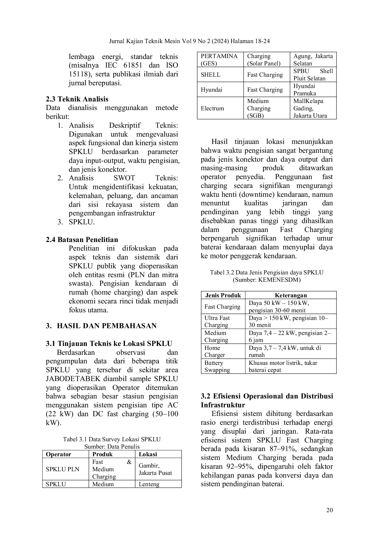 JURNAL KAJIAN TEKNIK MESINJURNAL KAJIAN TEKNIK MESINPenelitian ini bertujuan untuk menganalisis efektivitas teknis dan operasional Stasiun Pengisian Kendaraan Listrik Umum (SPKLU) di wilayah JABODETABEK dalam mendukung transisi energi menuju Net Zero Emission (NZE) tahun 2060. Melalui observasi lapangan dan studi teknis terhadap beberapa titik SPKLU yang dioperasikan oleh berbagai operator, ditemukan bahwa sistem pengisian cepat (fast charging) mampu mengurangi waktu tunggu pengisian namun menghasilkan panas berlebih yang berdampak pada umur baterai dan menuntut sistem pendinginan yang lebih kompleks. Efisiensi pengisian energi berkisar antara 87–95%, dengan sistem medium charging menunjukkan efisiensi lebih tinggi dibandingkan fast charging. Hambatan teknis utama meliputi ketidaksesuaian standar konektor, ketergantungan pada jaringan PLN, keterbatasan lokasi pengisian, serta seringnya gangguan sistem. Penelitian ini merekomendasikan penerapan sistem ganti baterai (battery swapping), integrasi dengan energi terbarukan, serta penetapan standar nasional untuk sistem pengisian dan pengelolaan limbah baterai. Kolaborasi lintas sektor antara pemerintah, industri, dan masyarakat menjadi kunci dalam mewujudkan ekosistem kendaraan listrik yang efisien dan berkelanjutan di Indonesia.