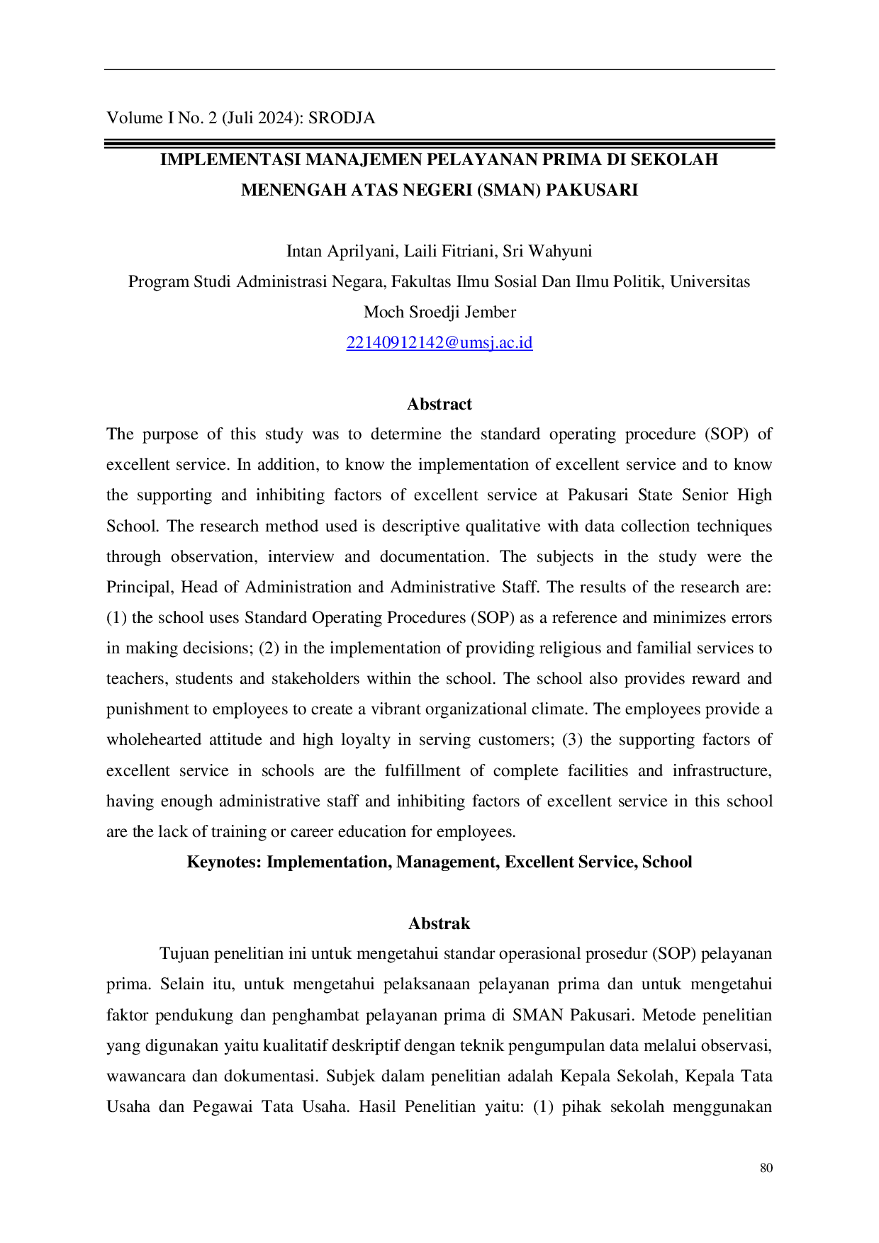 SRODJA : Sroedji Journal AdministrationSRODJA : Sroedji Journal AdministrationTujuan penelitian ini untuk mengetahui standar operasional prosedur (SOP) pelayanan prima. Selain itu, untuk mengetahui pelaksanaan pelayanan prima dan untuk mengetahui faktor pendukung dan penghambat pelayanan prima di SMAN Pakusari. Metode penelitian yang digunakan yaitu kualitatif deskriptif dengan teknik pengumpulan data melalui observasi, wawancara dan dokumentasi. Subjek dalam penelitian adalah Kepala Sekolah, Kepala Tata Usaha dan Pegawai Tata Usaha. Hasil Penelitian yaitu: (1) pihak sekolah menggunakan Standar Operasional Prosedur (SOP) pelayanan sebagai rujukan dan meminimalisir kesalahan dalam mengambil keputusan; (2) dalam pelaksanaan memberikan pelayanan yang religius dan kekeluargaan kepada guru, siswa dan para stakeholder yang ada di internal sekolah. Pihak sekolah juga memberikan reward and punishment kepada pegawai untuk menciptakan iklim organisasi yang bergairah. Para pegawai memberikan sikap sepenuh hati dan loyalitas yang tinggi dalam melayani pelanggan; (3) faktor pendukung pelayanan prima di sekolah yaitu terpenuhinya kelengkapan sarana dan prasarana, memiliki pegawai tata usaha yang cukup dan faktor penghambat pelayanan prima di sekolah ini yaitu kurangnya pelatihan atau pendidikan karir terhadap pegawai.