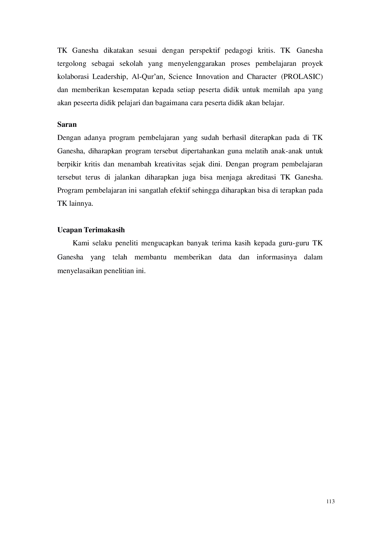 Berdasarkan hasil penelitian, disarankan untuk mempertahankan program pembelajaran yang sudah diterapkan di TK Ganesha guna melatih anak-anak berpikir kritis dan menambah kreativitas sejak dini. Program pembelajaran ini diharapkan dapat menjaga akreditasi TK Ganesha dan diterapkan di TK lainnya. Selain itu, penting untuk terus mengembangkan dan meningkatkan kualitas pembelajaran pedagogi kritis, termasuk dengan melibatkan orang tua dan masyarakat dalam proses pembelajaran, serta mengintegrasikan isu-isu sosial yang relevan dengan kehidupan anak-anak.