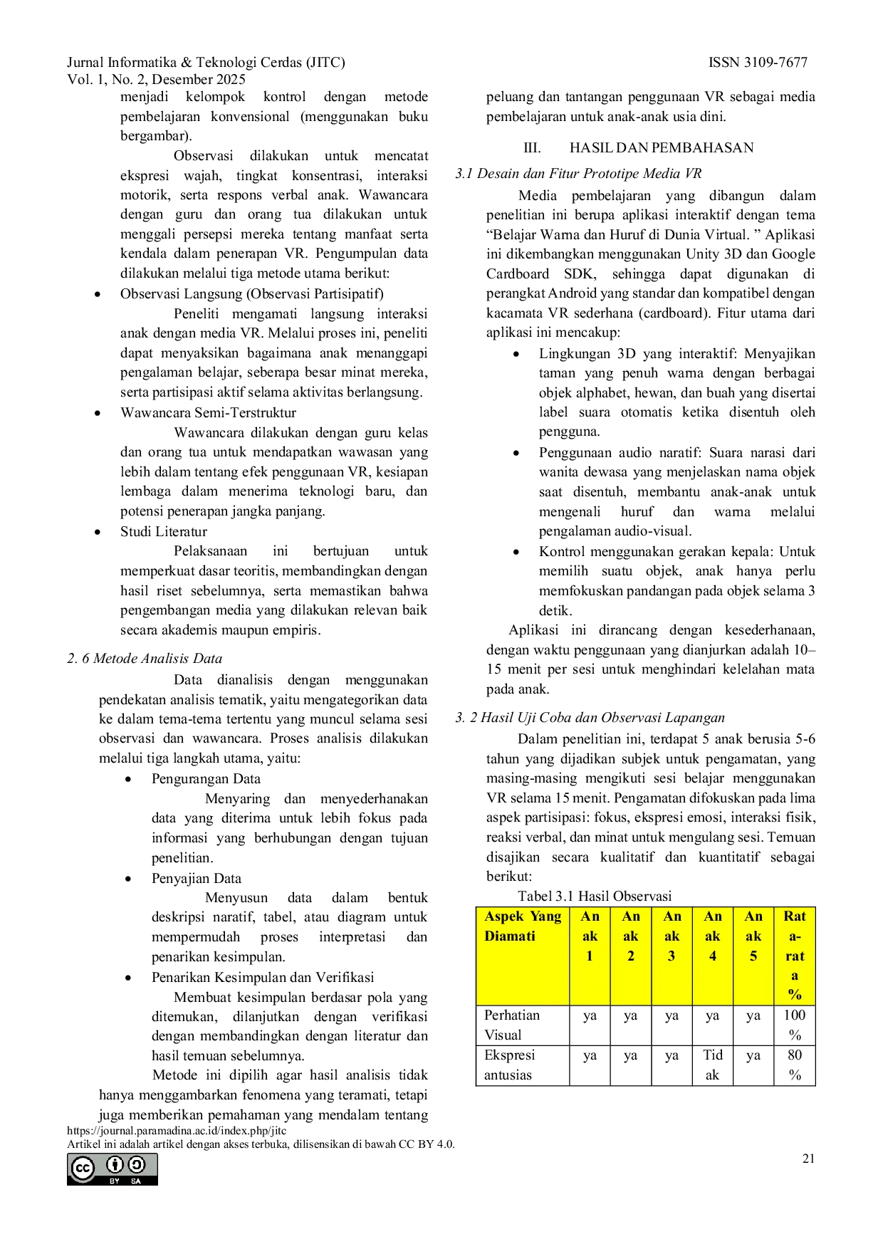 Jurnal Informatika & Teknologi CerdasJurnal Informatika & Teknologi CerdasDi tengah perkembangan teknologi informasi yang sangat cepat, cara pembelajaran tradisional mulai beralih ke metode digital yang lebih interaktif dan mendalam. Anak-anak di usia dini merupakan kelompok yang sangat penting dalam pengembangan sumber daya manusia, sehingga penerapan metode pengajaran yang tepat menjadi kunci untuk mencapai keberhasilan pendidikan jangka panjang. Penelitian ini bertujuan untuk menganalisis penggunaan teknologi Virtual Reality (VR) sebagai sarana edukatif yang dapat meningkatkan pembelajaran digital dan keterlibatan aktif anak selama proses belajar. Metodologi yang digunakan adalah kajian pustaka dan pengamatan awal terhadap minat belajar anak-anak usia dini melalui prototipe permainan edukasi VR sederhana yang berbasis 3D interaktif. Temuan awal menunjukkan bahwa pemanfaatan VR dapat meningkatkan konsentrasi, daya imajinasi, dan partisipasi anak dalam kegiatan pembelajaran. Kesimpulan dari penelitian ini menunjukkan bahwa Virtual Reality memiliki potensi untuk inovatif dalam mendukung perubahan menjadi pilihan pendidikan anak usia dini, terutama dalam pengajaran materi yang bersifat visual dan kinestetik. Penelitian ini juga memberikan kontribusi terhadap pencapaian Tujuan Pembangunan Berkelanjutan (SDG) nomor 4 dan 9.