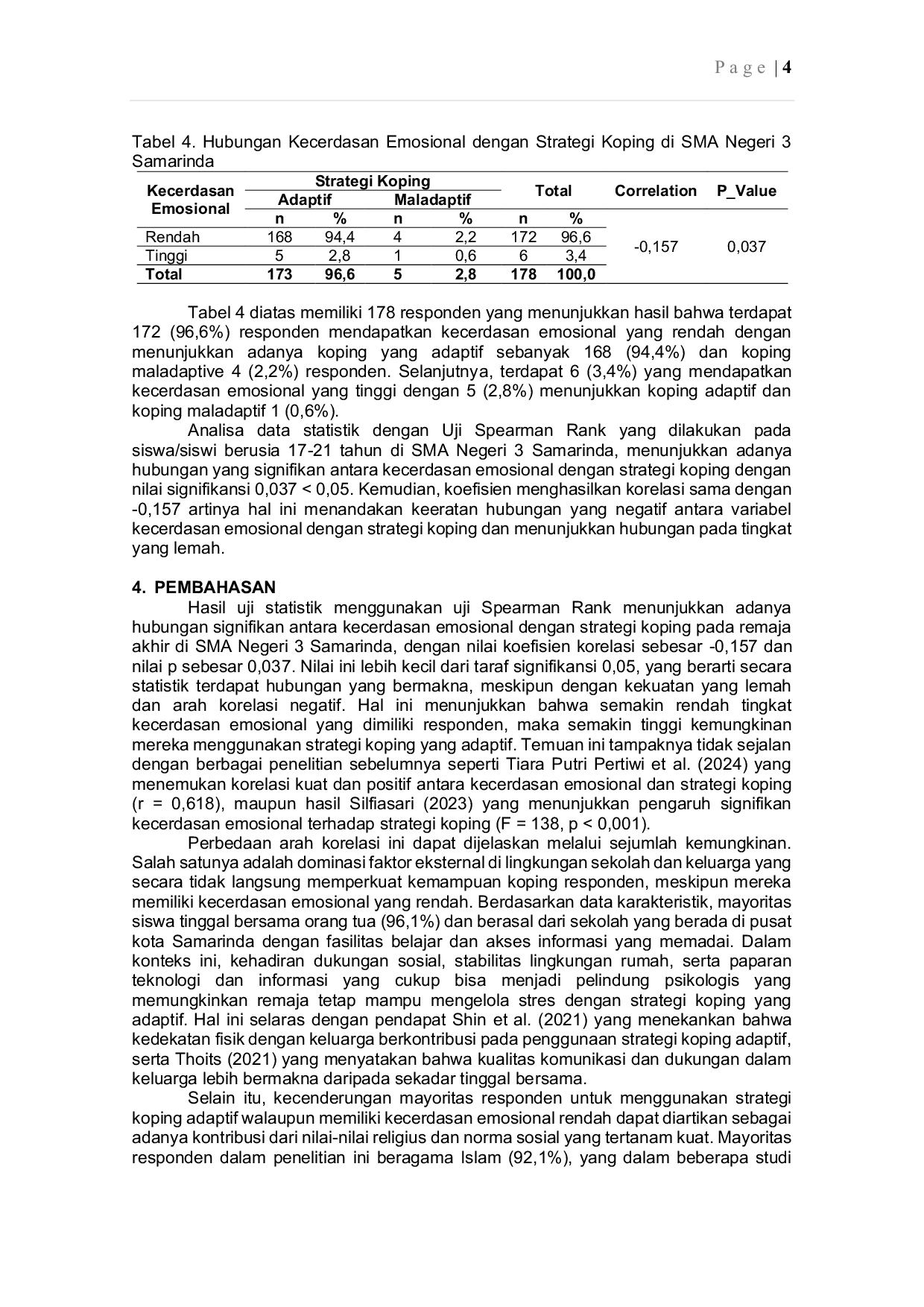 Penelitian ini menunjukkan bahwa terdapat hubungan signifikan antara kecerdasan emosional dan strategi koping pada remaja akhir di SMA Negeri 3 Samarinda, meskipun dengan kekuatan hubungan yang lemah dan arah negatif.Mayoritas remaja memiliki kecerdasan emosional rendah, namun tetap mampu menerapkan strategi koping adaptif.Diperlukan upaya sistematis dalam mengembangkan kapasitas remaja untuk mengelola stres melalui pendekatan yang integratif dan berbasis bukti, baik dalam ranah pendidikan formal maupun program kesehatan mental remaja di tingkat komunitas.