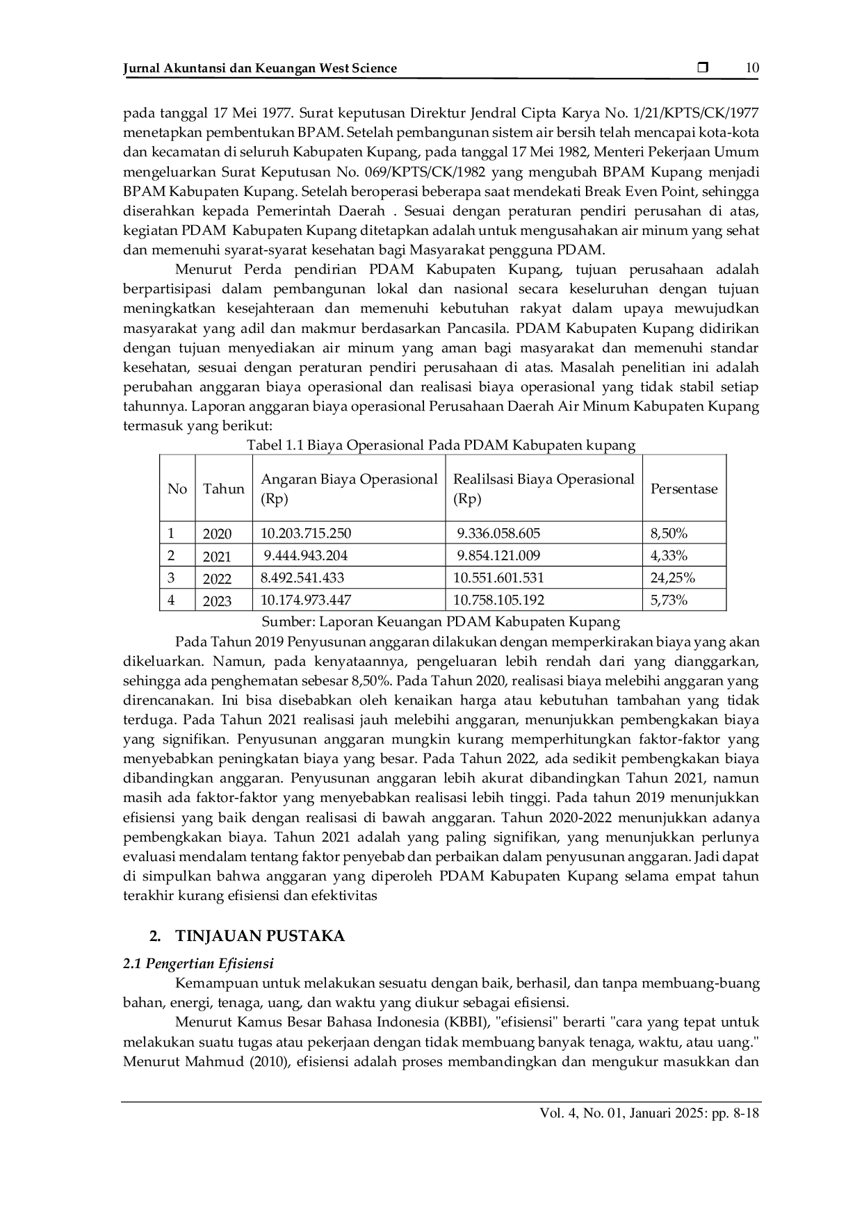 Jurnal Akuntansi Dan Keuangan West ScienceJurnal Akuntansi Dan Keuangan West SciencePenelitian ini bertujuan untuk mengetahui bagaimana efisiensi dan efektivitas pengendalian biaya operasional pada Perusahaan Daerah Air Minum (PDAM) Kabupaten Kupang Provinsi NTT. Hasil penelitian menunjukkan bahwa berdasarkan analisis terhadap data biaya operasional PDAM Kabupaten Kupang dari tahun 2019 hingga 2022, PDAM Kabupaten Kupang telah menunjukkan kinerja efisiensi yang fluktuatif selama empat tahun. Penilaian yang digunakan menunjukkan bahwa meskipun ada kenaikan biaya, perusahaan masih efisien dalam mengelola anggaran operasionalnya. Tahun 2021 PDAM Kabupaten Kupang menunjukkan tantangan besar dalam menjaga efisiensi perusahaan. Perusahaan Daerah Air Minum perlu memperhatikan dan memitigasi faktor-faktor yang menyebabkan penurunan efisiensi di tahun 2021. Efektivitas pengendalian biaya operasional selama periode 2019 hingga 2022 telah berjalan dengan efektif sesuai dengan standar yang ditetapkan PDAM.