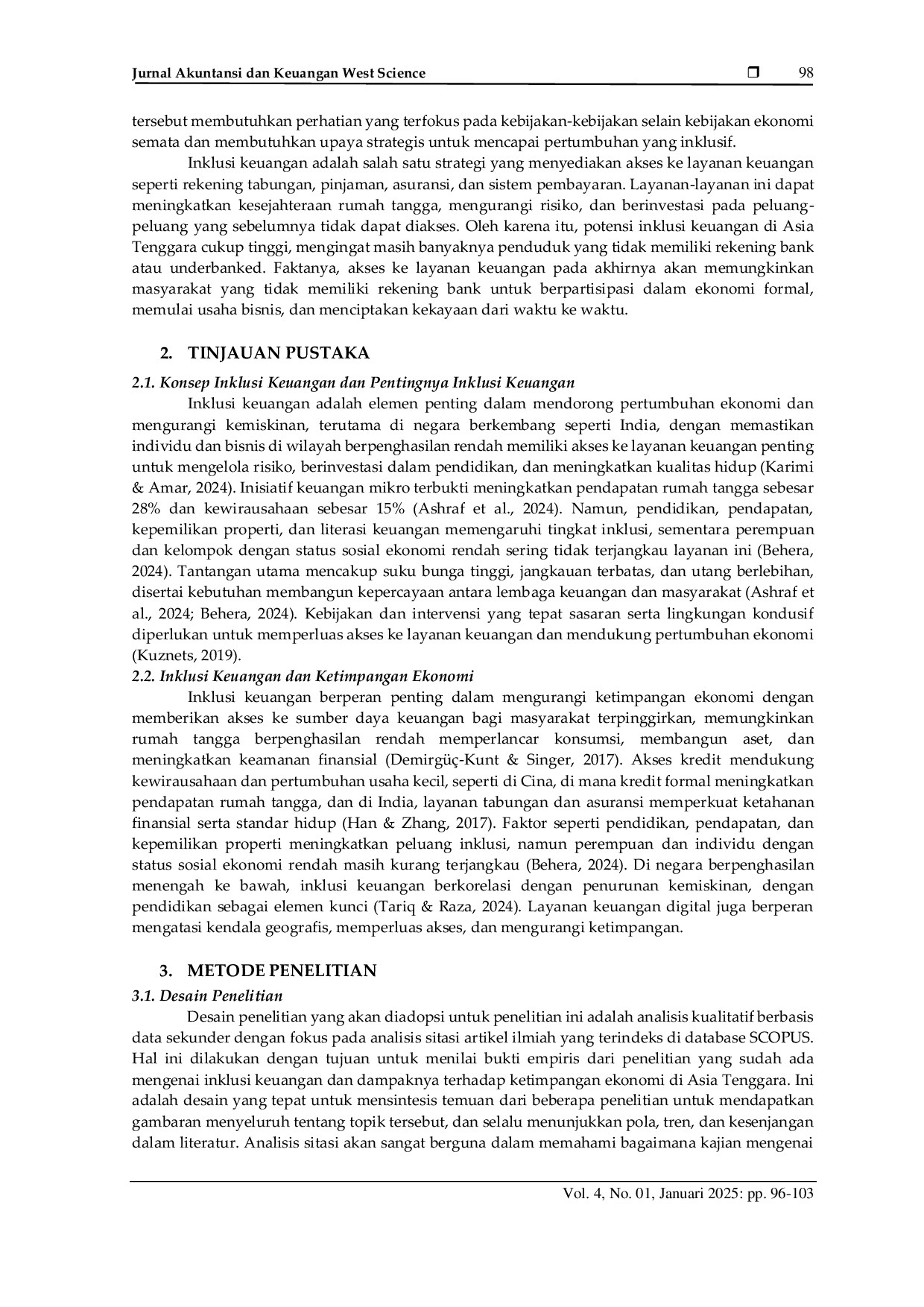 Jurnal Akuntansi Dan Keuangan West ScienceJurnal Akuntansi Dan Keuangan West ScienceMakalah ini membahas bagaimana inklusi keuangan berkontribusi dalam mengurangi ketimpangan ekonomi di kawasan Asia Tenggara. Studi ini menggunakan analisis kutipan dari 20 artikel yang diulas oleh rekan sejawat yang diindeks ke database SCOPUS untuk membahas tren utama, temuan, dan tema yang muncul dari literatur mengenai inklusi keuangan dan potensi penggunaannya dalam mengatasi kesenjangan pendapatan. Kajian ini mengidentifikasi bahwa inklusi keuangan, yang dimanifestasikan dalam bentuk akses ke perbankan, keuangan mikro, mobile banking, dan program-program literasi keuangan, sangat membantu dalam pengentasan kemiskinan dan pemerataan ekonomi. Meskipun layanan keuangan digital telah mencapai kemajuan luar biasa dalam meningkatkan akses keuangan, masih ada tantangan yang dihadapi terkait daerah pedesaan dan terpencil, kesenjangan gender, dan literasi digital. Studi ini menyimpulkan bahwa kebijakan pemerintah dan dukungan internasional diperlukan untuk meningkatkan inklusi keuangan guna menjamin hasil ekonomi yang lebih luas dan merata. Studi ini menyimpulkan bahwa meskipun inklusi keuangan telah muncul sebagai alat yang efektif dalam mengurangi ketidaksetaraan, upaya-upaya di luar bidang ini diperlukan untuk mengatasi kesenjangan yang masih ada dalam hal akses dan memberdayakan kelompok-kelompok yang terpinggirkan.