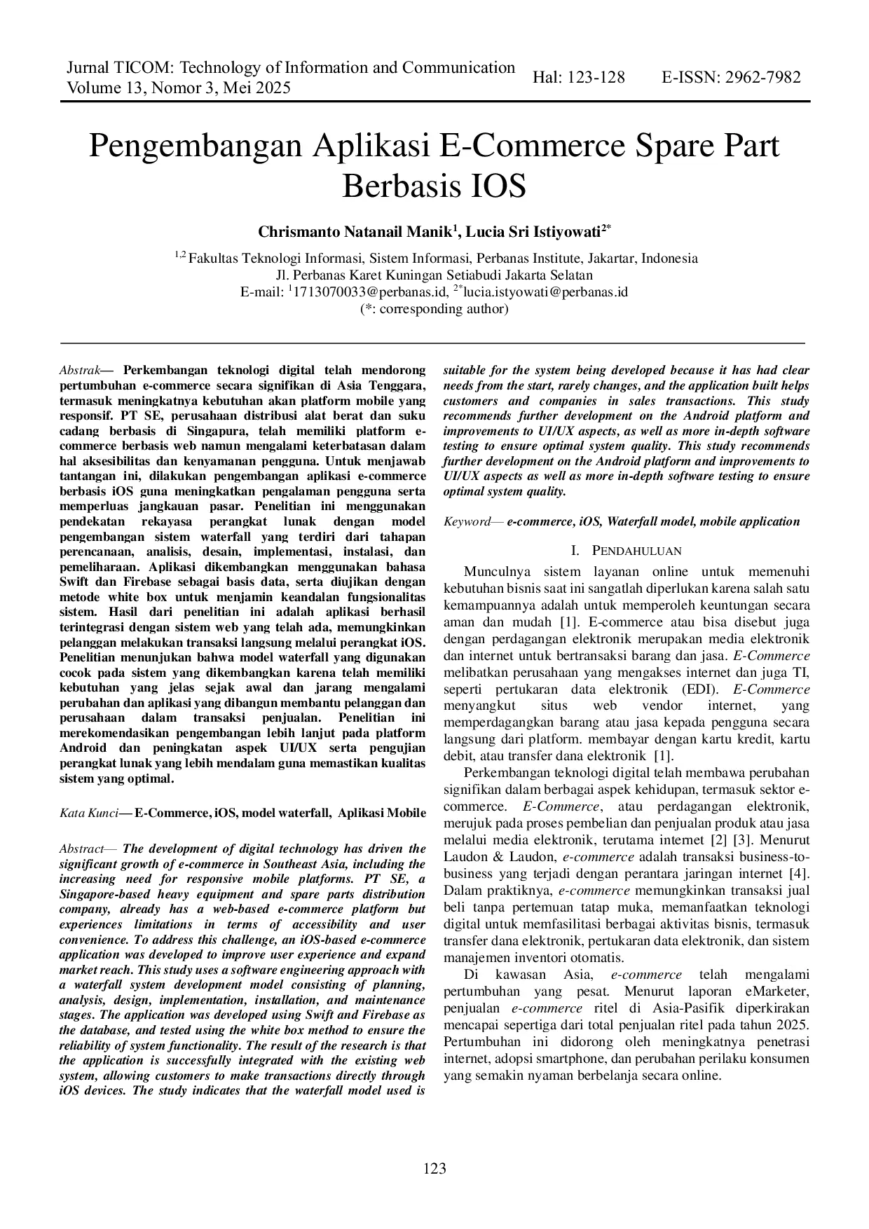 Jurnal Ticom: Technology of Information and CommunicationJurnal Ticom: Technology of Information and CommunicationPerkembangan teknologi digital telah mendorong pertumbuhan e-commerce secara signifikan di Asia Tenggara, termasuk meningkatnya kebutuhan akan platform mobile yang responsif. PT SE, perusahaan distribusi alat berat dan suku cadang berbasis di Singapura, telah memiliki platform e-commerce berbasis web namun mengalami keterbatasan dalam hal aksesibilitas dan kenyamanan pengguna. Untuk menjawab tantangan ini, dilakukan pengembangan aplikasi e-commerce berbasis iOS guna meningkatkan pengalaman pengguna serta memperluas jangkauan pasar. Penelitian ini menggunakan pendekatan rekayasa perangkat lunak dengan model pengembangan sistem waterfall yang terdiri dari tahapan perencanaan, analisis, desain, implementasi, instalasi, dan pemeliharaan. Aplikasi dikembangkan menggunakan bahasa Swift dan Firebase sebagai basis data, serta diujikan dengan metode white box untuk menjamin keandalan fungsionalitas sistem. Hasil dari penelitian ini adalah aplikasi berhasil terintegrasi dengan sistem web yang telah ada, memungkinkan pelanggan melakukan transaksi langsung melalui perangkat iOS. Penelitian menunjukkan bahwa model waterfall yang digunakan cocok pada sistem yang dikembangkan karena telah memiliki kebutuhan yang jelas sejak awal dan jarang mengalami perubahan, serta aplikasi yang dibangun membantu pelanggan dan perusahaan dalam transaksi penjualan. Penelitian ini merekomendasikan pengembangan lebih lanjut pada platform Android dan peningkatan aspek UI/UX serta pengujian perangkat lunak yang lebih mendalam guna memastikan kualitas sistem yang optimal.