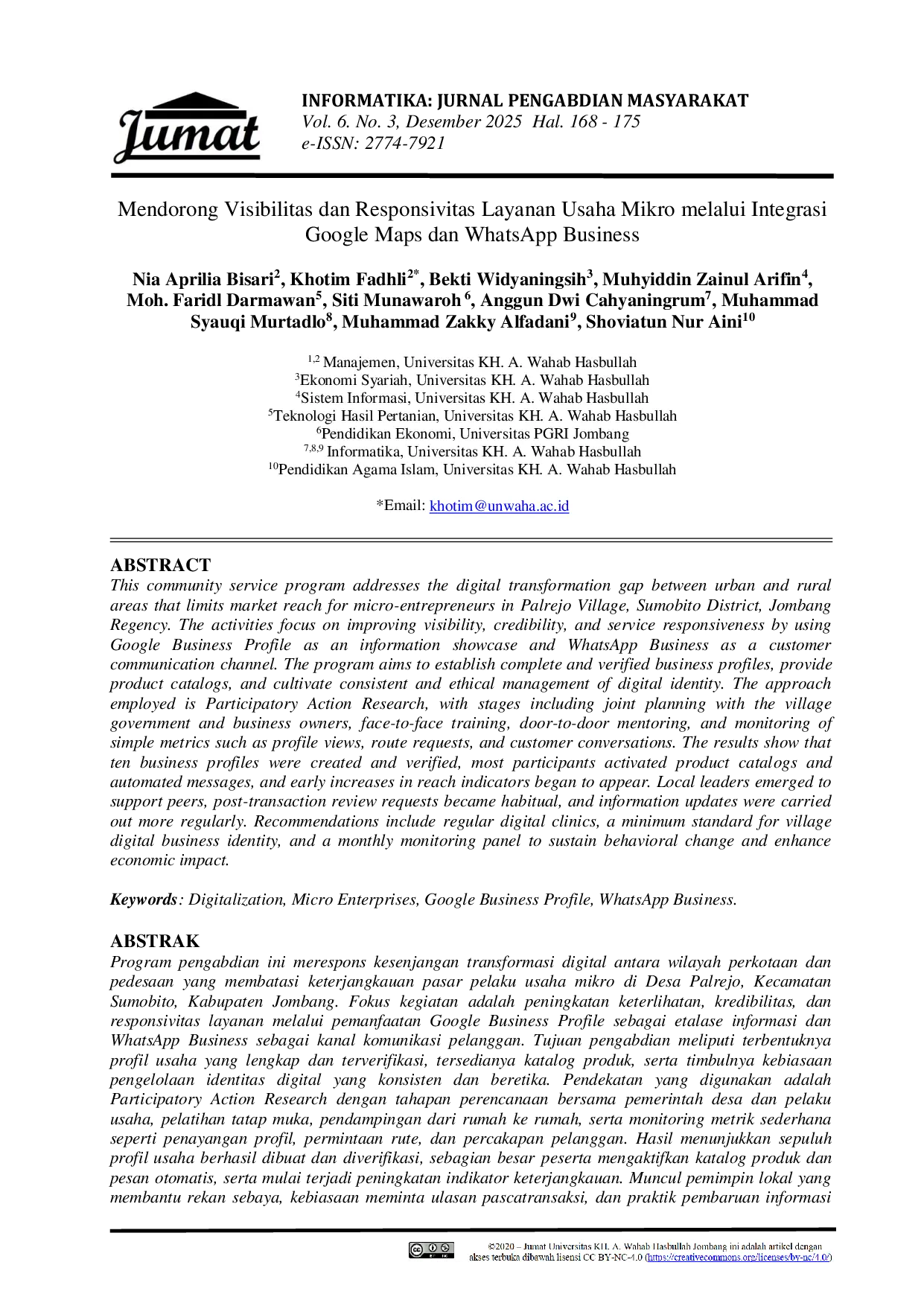 Jumat Informatika: Jurnal Pengabdian MasyarakatJumat Informatika: Jurnal Pengabdian MasyarakatProgram pengabdian ini merespons kesenjangan transformasi digital antara wilayah perkotaan dan pedesaan yang membatasi keterjangkauan pasar pelaku usaha mikro di Desa Palrejo, Kecamatan Sumobito, Kabupaten Jombang. Fokus kegiatan adalah peningkatan keterlihatan, kredibilitas, dan responsivitas layanan melalui pemanfaatan Google Business Profile sebagai etalase informasi dan WhatsApp Business sebagai kanal komunikasi pelanggan. Tujuan pengabdian meliputi terbentuknya profil usaha yang lengkap dan terverifikasi, tersedianya katalog produk, serta timbulnya kebiasaan pengelolaan identitas digital yang konsisten dan beretika. Pendekatan yang digunakan adalah Participatory Action Research dengan tahapan perencanaan bersama pemerintah desa dan pelaku usaha, pelatihan tatap muka, pendampingan dari rumah ke rumah, serta monitoring metrik sederhana seperti penayangan profil, permintaan rute, dan percakapan pelanggan. Hasil menunjukkan sepuluh profil usaha berhasil dibuat dan diverifikasi, sebagian besar peserta mengaktifkan katalog produk dan pesan otomatis, serta mulai terjadi peningkatan indikator keterjangkauan. Muncul pemimpin lokal yang membantu rekan sebaya, kebiasaan meminta ulasan pascatransaksi, dan praktik pembaruan informasi yang lebih teratur. Rekomendasi meliputi klinik digital berkala, standar minimum identitas digital desa, dan panel pemantauan bulanan agar perubahan perilaku dan dampak ekonomi dapat terjaga dan ditingkatkan.