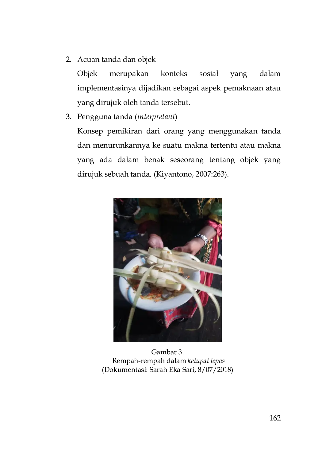 Pascasarjana ISBI Bandung Conference SeriesPascasarjana ISBI Bandung Conference SeriesSebagian masyarakat Betawi di Bekasi masih sering melakukan upacara-upacara ritual. Salah satunya upacara narik ketupat lepas yang bertujuan memenuhi hutang seseorang yang punya nazar. Tujuan penulisan kajian ini untuk mengungkap simbol-simbol yang ada dalam material upacara narik ketupat lepas adat Betawi di Bekasi. Adapun teori yang digunakan dalam penulisan ini adalah semiotika Charles Sanders Peirce. Adapun metode yang digunakan dalam kajian ini adalah metode penelitian kualitatif dengan analisis semiotik. Analisis semiotika secara khusus meneliti bagaimana beberapa bagian teks (kata, gambar, film, iklan majalah, lagu, benda dan lain-lain).