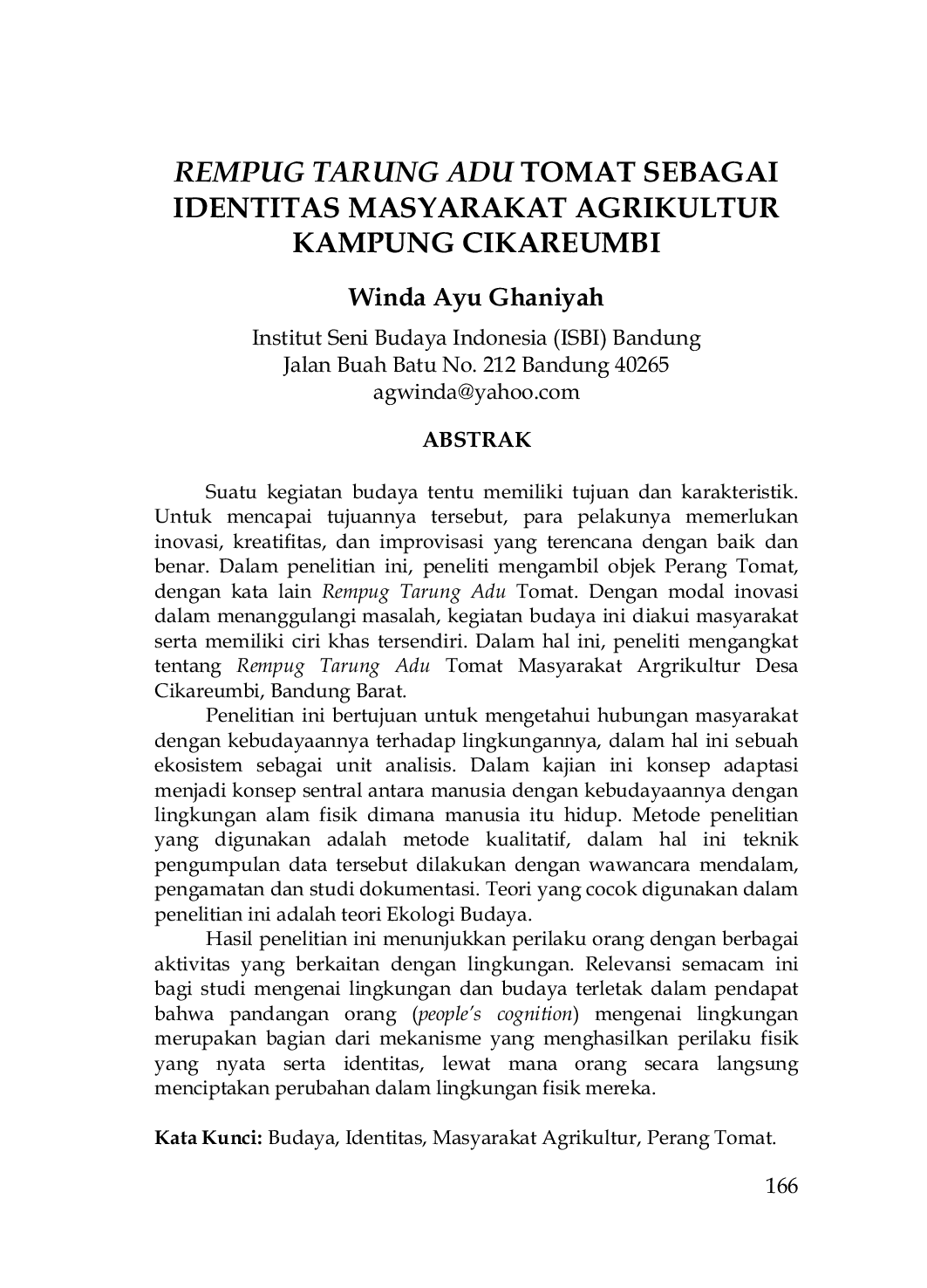 Pascasarjana ISBI Bandung Conference SeriesPascasarjana ISBI Bandung Conference SeriesSuatu kegiatan budaya tentu memiliki tujuan dan karakteristik. Untuk mencapai tujuannya tersebut, para pelakunya memerlukan inovasi, kreativitas, dan improvisasi yang terencana dengan baik dan benar. Dalam penelitian ini, peneliti mengambil objek Perang Tomat, dengan kata lain Rempug Tarung Adu Tomat. Dengan modal inovasi dalam menanggulangi masalah, kegiatan budaya ini diakui masyarakat serta memiliki ciri khas tersendiri. Dalam hal ini, peneliti mengangkat tentang Rempug Tarung Adu Tomat Masyarakat Argrikultur Desa Cikareumbi, Bandung Barat. Penelitian ini bertujuan untuk mengetahui hubungan masyarakat dengan kebudayaannya terhadap lingkungannya, dalam hal ini sebuah ekosistem sebagai unit analisis. Dalam kajian ini konsep adaptasi menjadi konsep sentral antara manusia dengan kebudayaannya dengan lingkungan alam fisik dimana manusia itu hidup. Metode penelitian yang digunakan adalah metode kualitatif, dalam hal ini teknik pengumpulan data tersebut dilakukan dengan wawancara mendalam, pengamatan dan studi dokumentasi. Teori yang cocok digunakan dalam penelitian ini adalah teori Ekologi Budaya.