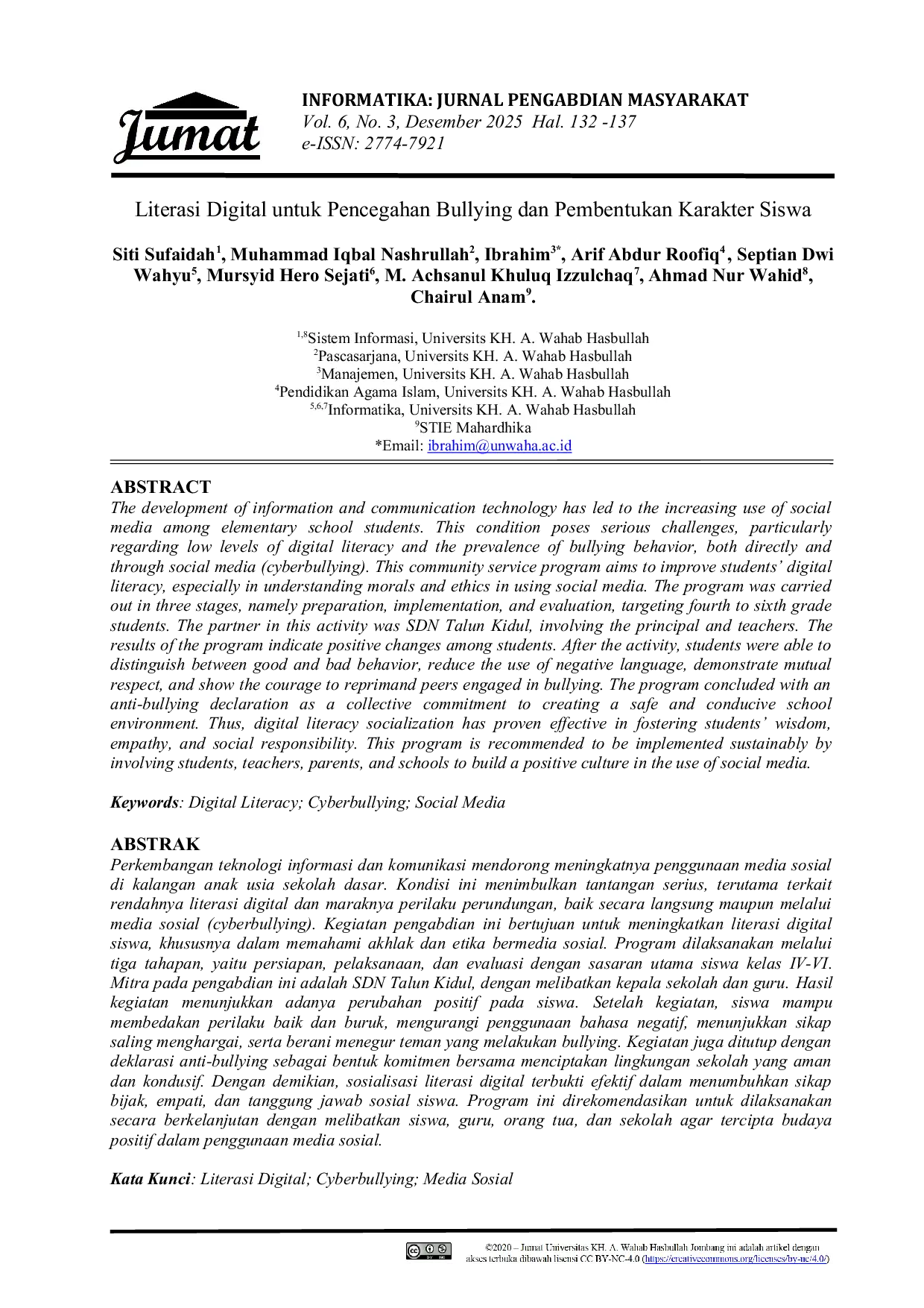 Jumat Informatika: Jurnal Pengabdian MasyarakatJumat Informatika: Jurnal Pengabdian MasyarakatPerkembangan teknologi informasi dan komunikasi mendorong meningkatnya penggunaan media sosial di kalangan anak usia sekolah dasar. Kondisi ini menimbulkan tantangan serius, terutama terkait rendahnya literasi digital dan maraknya perilaku perundungan, baik secara langsung maupun melalui media sosial (cyberbullying). Kegiatan pengabdian ini bertujuan untuk meningkatkan literasi digital siswa, khususnya dalam memahami akhlak dan etika bermedia sosial. Program dilaksanakan melalui tiga tahapan, yaitu persiapan, pelaksanaan, dan evaluasi dengan sasaran utama siswa kelas IV-VI. Mitra pada pengabdian ini adalah SDN Talun Kidul, dengan melibatkan kepala sekolah dan guru. Hasil kegiatan menunjukkan adanya perubahan positif pada siswa. Setelah kegiatan, siswa mampu membedakan perilaku baik dan buruk, mengurangi penggunaan bahasa negatif, menunjukkan sikap saling menghargai, serta berani menegur teman yang melakukan bullying. Kegiatan juga ditutup dengan deklarasi anti-bullying sebagai bentuk komitmen bersama menciptakan lingkungan sekolah yang aman dan kondusif. Dengan demikian, sosialisasi literasi digital terbukti efektif dalam menumbuhkan sikap bijak, empati, dan tanggung jawab sosial siswa. Program ini direkomendasikan untuk dilaksanakan secara berkelanjutan dengan melibatkan siswa, guru, orang tua, dan sekolah agar tercipta budaya positif dalam penggunaan media sosial.