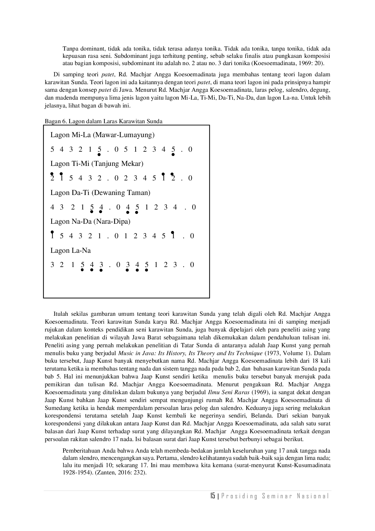 Pascasarjana ISBI Bandung Conference SeriesPascasarjana ISBI Bandung Conference SeriesTeori karawitan Sunda khususnya tentang laras, surupan, patet, dan lagon tidak pernah berkembang (stagnan). Apabila dihitung dari kurun waktu terbitnya buku Ilmu Seni Raras (1969), sudah hampir 56 tahun teori karawitan Sunda karya Rd. Machjar Angga Koesoemadinata berjalan di tempat (tidak mengalami kemajuan) walaupun beberapa tulisan dari peneliti asing telah menyampaikan kritikannya terhadap teori karawitan Sunda tersebut. Fenomena ini merupakan permasalahan krusial yang perlu segera ditindaklanjuti (melalui penelitian ulang yang berkelanjutan) karena teori karawitan Sunda tidak hanya digunakan sebagai materi pembelajaran di sekolah-sekolah seni dan perguruan tinggi seni, tetapi juga digunakan sebagai acuan dalam praktik memainkan karawitan Sunda. Sehubungan dengan permasalahan tersebut, perlu dikemukakan beberapa hal yang mendasari keraguan para peneliti asing terhadap teori karawitan Sunda Rd. Machjar Angga Koesoemadinata dan mengapa teori karawitan Sunda perlu dikaji ulang melalui penelitian yang berkelanjutan. Berdasarkan hasil analisis dan diskusi terhadap teori laras, surupan, patet, dan lagon ditemukan titik kelemahan teori karawitan Sunda yang disebabkan oleh cara berpikir yang terlalu berorientasi pada teori musik Barat. Dengan demikian, sudah saatnya teori karawitan Sunda dikaji ulang, diteliti kembali, dan dikembangkan sesuai dengan sifat dan karakteristik “ilmu itu sendiri yang seharusnya diperkaya dan dikembangkan secara berkelanjutan sesuai dengan perkembangan praktik karawitannya itu sendiri.