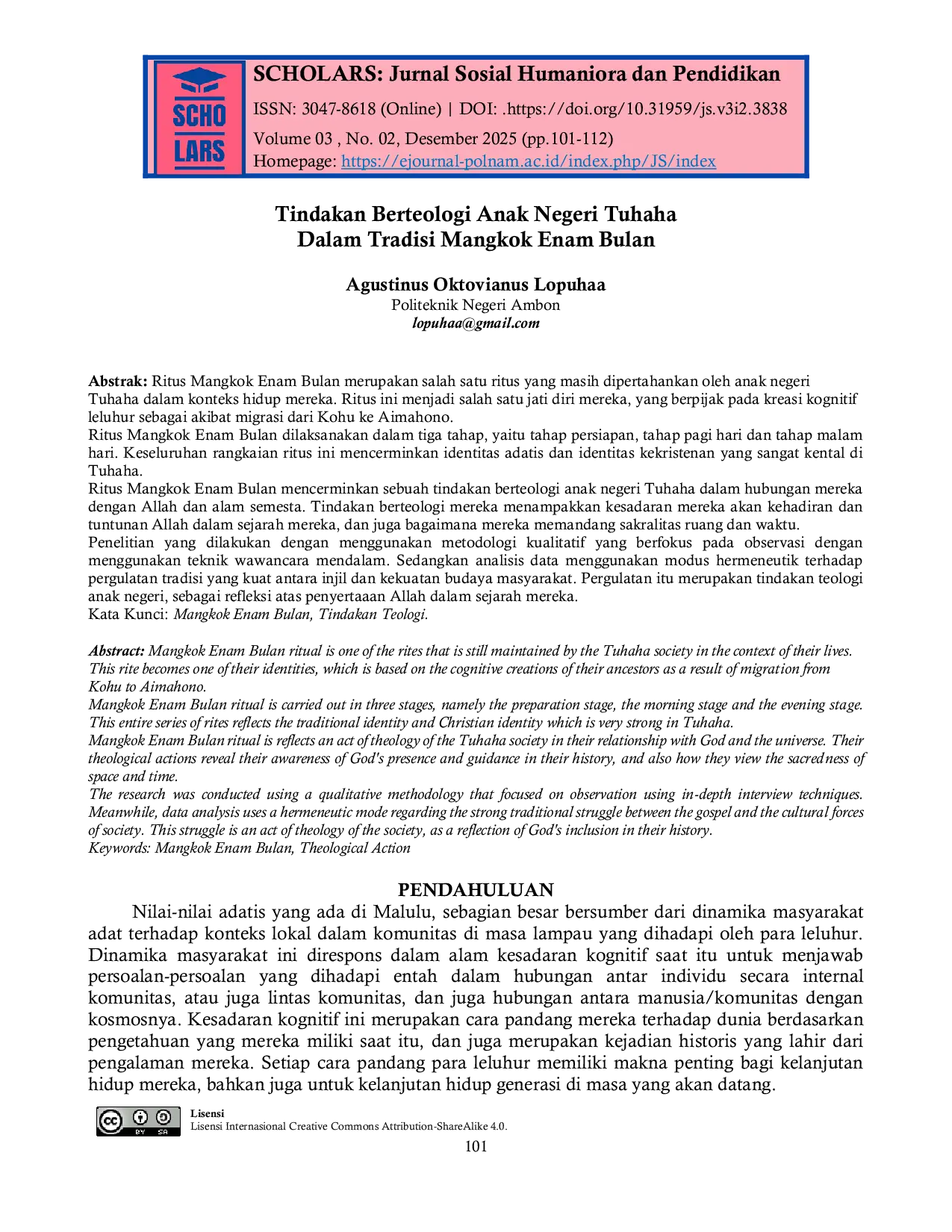 Scholars: Jurnal Sosial Humaniora dan PendidikanScholars: Jurnal Sosial Humaniora dan PendidikanRitus Mangkok Enam Bulan merupakan salah satu ritus yang masih dipertahankan oleh anak negeri Tuhaha dalam konteks hidup mereka. Ritus ini menjadi salah satu jati diri mereka, yang berpijak pada kreasi kognitif leluhur sebagai akibat migrasi dari Kohu ke Aimahono. Ritus Mangkok Enam Bulan dilaksanakan dalam tiga tahap, yaitu tahap persiapan, tahap pagi hari dan tahap malam hari. Keseluruhan rangkaian ritus ini mencerminkan identitas adatis dan identitas kekristenan yang sangat kental di Tuhaha. Ritus Mangkok Enam Bulan mencerminkan sebuah tindakan berteologi anak negeri Tuhaha dalam hubungan mereka dengan Allah dan alam semesta. Tindakan berteologi mereka menampakkan kesadaran mereka akan kehadiran dan tuntunan Allah dalam sejarah mereka, dan juga bagaimana mereka memandang sakralitas ruang dan waktu. Penelitian yang dilakukan dengan menggunakan metodologi kualitatif yang berfokus pada observasi dengan menggunakan teknik wawancara mendalam. Sedangkan analisis data menggunakan modus hermeneutik terhadap pergulatan tradisi yang kuat antara injil dan kekuatan budaya masyarakat. Pergulatan itu merupakan tindakan teologi anak negeri, sebagai refleksi atas penyertaaan Allah dalam sejarah mereka.