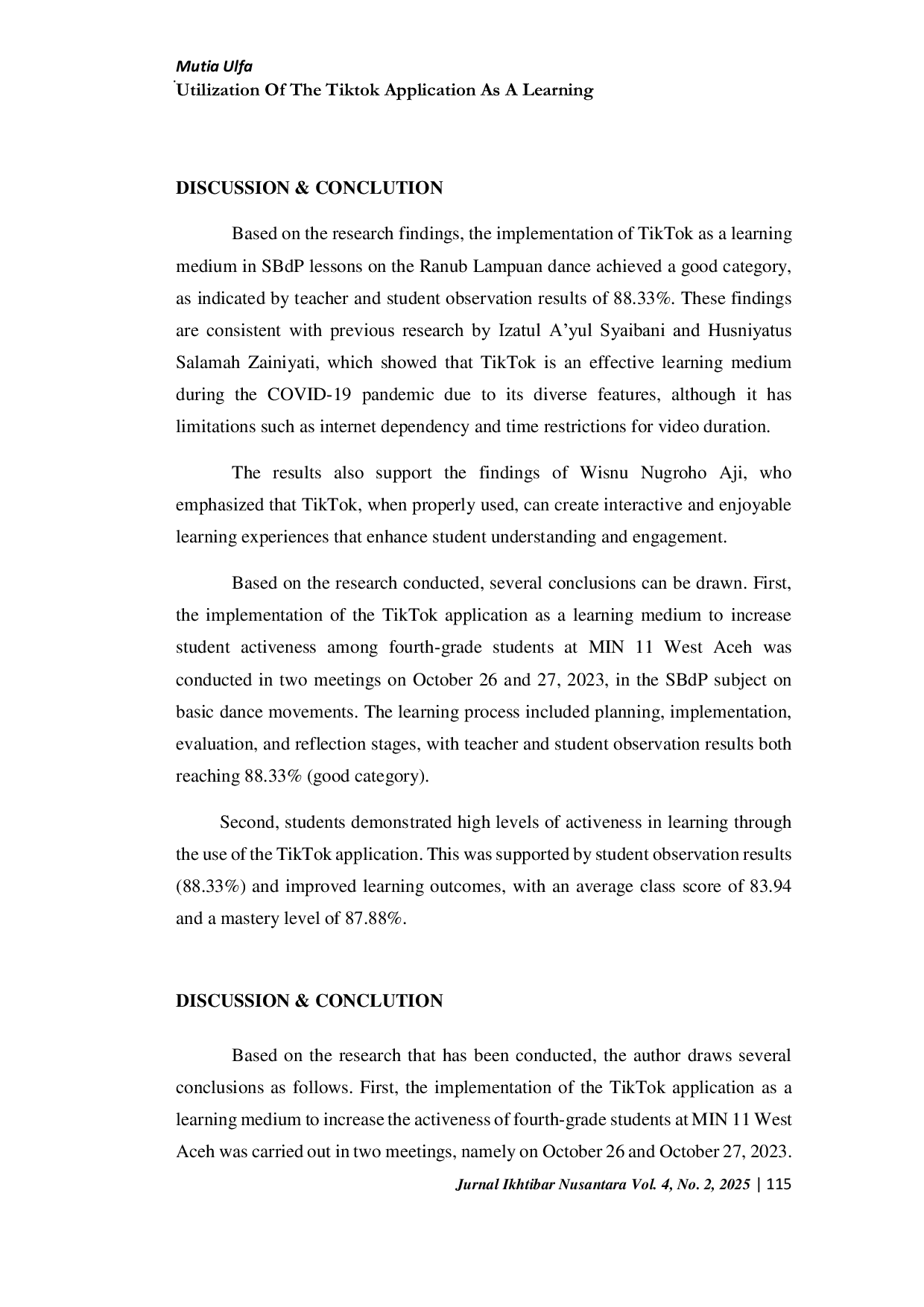 Based on the research conducted, it can be concluded that the implementation of the TikTok application as a learning medium to enhance student engagement in fourth-grade students at MIN 11 West Aceh was successfully carried out in two meetings on October 26th and 27th, 2023, in the Arts, Culture, and Crafts (SBdP) subject, specifically focusing on basic dance movements.Furthermore, students demonstrated a high level of engagement in learning through the utilization of the TikTok application, as evidenced by observation results and improved learning outcomes.Therefore, the use of TikTok as a learning medium has proven to be effective in increasing student activity and improving learning achievements.