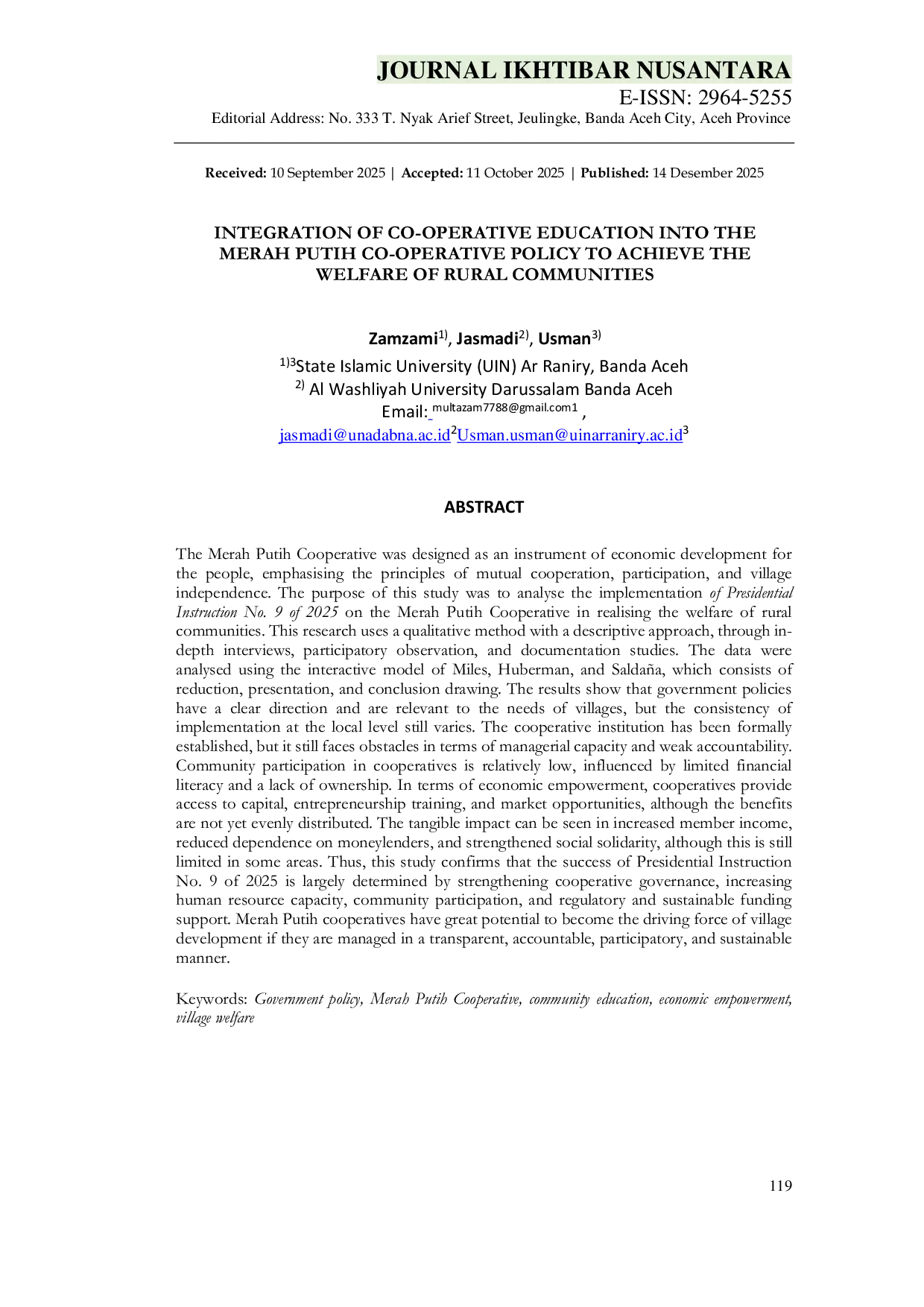 Jurnal Ikhtibar NusantaraJurnal Ikhtibar NusantaraKoperasi Merah Putih dirancang sebagai instrumen pembangunan ekonomi rakyat, menekankan prinsip saling membantu, partisipasi, dan kemandirian desa. Tujuan penelitian ini adalah menganalisis implementasi Instruksi Presiden Nomor 9 Tahun 2025 tentang Koperasi Merah Putih dalam mewujudkan kesejahteraan masyarakat pedesaan. Penelitian ini menggunakan metode kualitatif dengan pendekatan deskriptif melalui wawancara mendalam, observasi partisipatif, dan studi dokumentasi. Data dianalisis menggunakan model interaktif Miles, Huberman, dan Saldaña yang terdiri dari reduksi, penyajian, dan penarikan kesimpulan. Hasil menunjukkan bahwa kebijakan pemerintah memiliki arah yang jelas dan relevan dengan kebutuhan desa, namun konsistensi pelaksanaan di tingkat lokal masih bervariasi. Lembaga koperasi telah secara formal didirikan, tetapi masih menghadapi hambatan dalam hal kapasitas manajerial dan akuntabilitas yang lemah. Partisipasi masyarakat dalam koperasi relatif rendah, dipengaruhi oleh literasi keuangan yang terbatas dan kurangnya rasa memiliki. Dalam hal pemberdayaan ekonomi, koperasi menyediakan akses terhadap modal, pelatihan kewirausahaan, dan peluang pasar, meskipun manfaatnya belum merata. Dampak nyata terlihat pada peningkatan pendapatan anggota, pengurangan ketergantungan pada rentenir, dan penguatan solidaritas sosial, meskipun masih terbatas di beberapa wilayah. Dengan demikian, penelitian ini menegaskan bahwa keberhasilan Instruksi Presiden Nomor 9 Tahun 2025 sangat ditentukan oleh penguatan tata kelola koperasi, peningkatan kapasitas sumber daya manusia, partisipasi masyarakat, serta dukungan regulasi dan pendanaan yang berkelanjutan. Koperasi Merah Putih memiliki potensi besar menjadi penggerak pembangunan desa jika dikelola secara transparan, akuntabel, partisipatif, dan berkelanjutan.