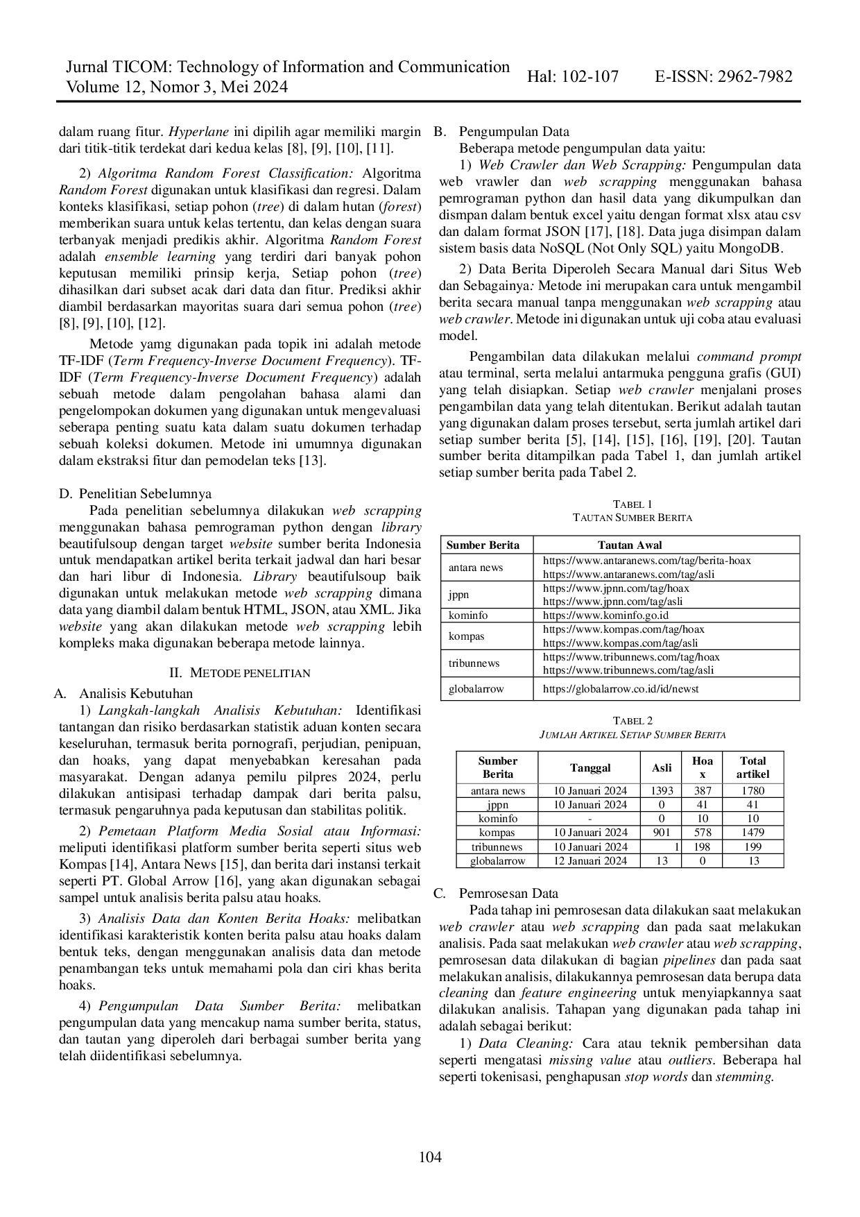 Jurnal Ticom: Technology of Information and CommunicationJurnal Ticom: Technology of Information and CommunicationBerdasarkan statistik aduan konten yang tercatat di website Kominfo, laporan isu hoaks terus meningkat secara signifikan. Isu hoaks dapat berupa fitnah, penipuan, kekerasan, terorisme, atau radikalisme, yang berdampak negatif pada masyarakat, seperti ketidakpercayaan, kekacauan sosial, dan ketidakstabilan politik. Untuk mengatasi permasalahan ini, dikembangkan sebuah sistem pendeteksi berita hoaks menggunakan metode TF-IDF, algoritma Support Vector Machine (SVM), dan algoritma Random Forest. Hasil evaluasi menunjukkan tingkat akurasi di atas 90% pada pengujian pertama, namun menurun menjadi sekitar 55% pada pengujian kedua. Meskipun demikian, model ini memberikan prediksi yang cukup baik dengan performa sedang.