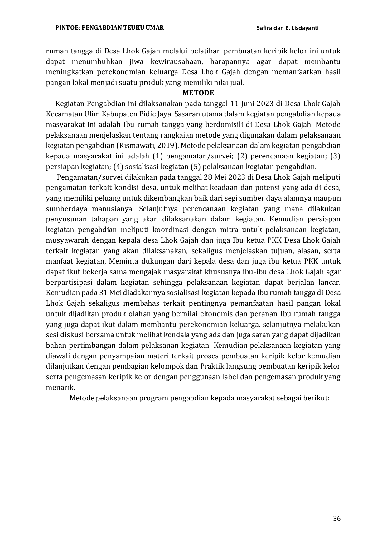 Pintoe: Pengabdian Teuku UmarPintoe: Pengabdian Teuku UmarTujuan dari kegiatan pengabdian kepada masyarakat ini adalah untuk memotivasi, meningkatkan kreativitas dan pengetahuan masyarakat dalam mengolah hasil pangan lokal serta menumbuhkan jiwa kewirausahaan khususnya bagi ibu-ibu di desa Lhok Gajah untuk membantu meningkatkan ekonomi keluarga masyarakat desa Lhok Gajah. Metode pengabdian dengan penyuluhan, diskusi dan tanya jawab serta praktik langsung pengolahan daun kelor menjadi produk keripik kelor yang kaya manfaat dan bernilai ekonomis. Hasil kegiatan ini diharapkan dapat turut berkontribusi membangun desa Lhok Gajah dengan kerjasama ibu-ibu PKK nya dalam berbagi pengetahuan, mendorong masyarakat untuk pengembangan sumberdaya yang dimiliki secara berkelanjutan untuk meningkatkan ekonomi keluarga. Pelatihan pembuatan keripik daun kelor ini dimaksudkan dapat memberikan motivasi bagi masyarakat untuk meningkatkan kemampuannya dan berkarya sehingga mendatangkan manfaat bagi dirinya dan masyarakat sekitar.
