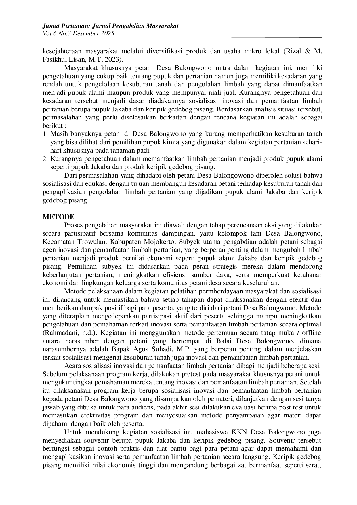 Jumat Pertanian: Jurnal Pengabdian MasyarakatJumat Pertanian: Jurnal Pengabdian MasyarakatKegiatan pengabdian masyarakat yang bertempat di Desa Balongwono, Kecamatan Trowulan, Kabupaten Mojokerto ini, bertujuan untuk meningkatkan kesadaran dan pemahaman petani mengenai inovasi serta pemanfaatan limbah pertanian melalui pengenalan pupuk organik cair Jakaba dan produk olahan keripik gedebog pisang. Pupuk Jakaba yang berasal dari fermentasi air cucian beras terbukti mampu memperbaiki kesuburan tanah, mempercepat pertumbuhan tanaman, serta mengurangi ketergantungan pada pupuk kimia, sedangkan keripik gedebog pisang menjadi alternatif produk bernilai ekonomis dari limbah batang pisang yang selama ini kurang dimanfaatkan. Metode pelaksanaan dilakukan melalui sosialisasi tatap muka, diskusi interaktif, serta pemberian souvenir produk kepada petani. Hasil kegiatan menunjukkan peningkatan signifikan pemahaman petani, ditunjukkan dengan kenaikan nilai rata-rata pre-test 79,54 menjadi 90,28 pada post-test, sehingga program ini terbukti efektif dalam mendorong terciptanya pertanian berkelanjutan, pemanfaatan limbah bernilai tambah, serta peningkatan kesejahteraan masyarakat desa.