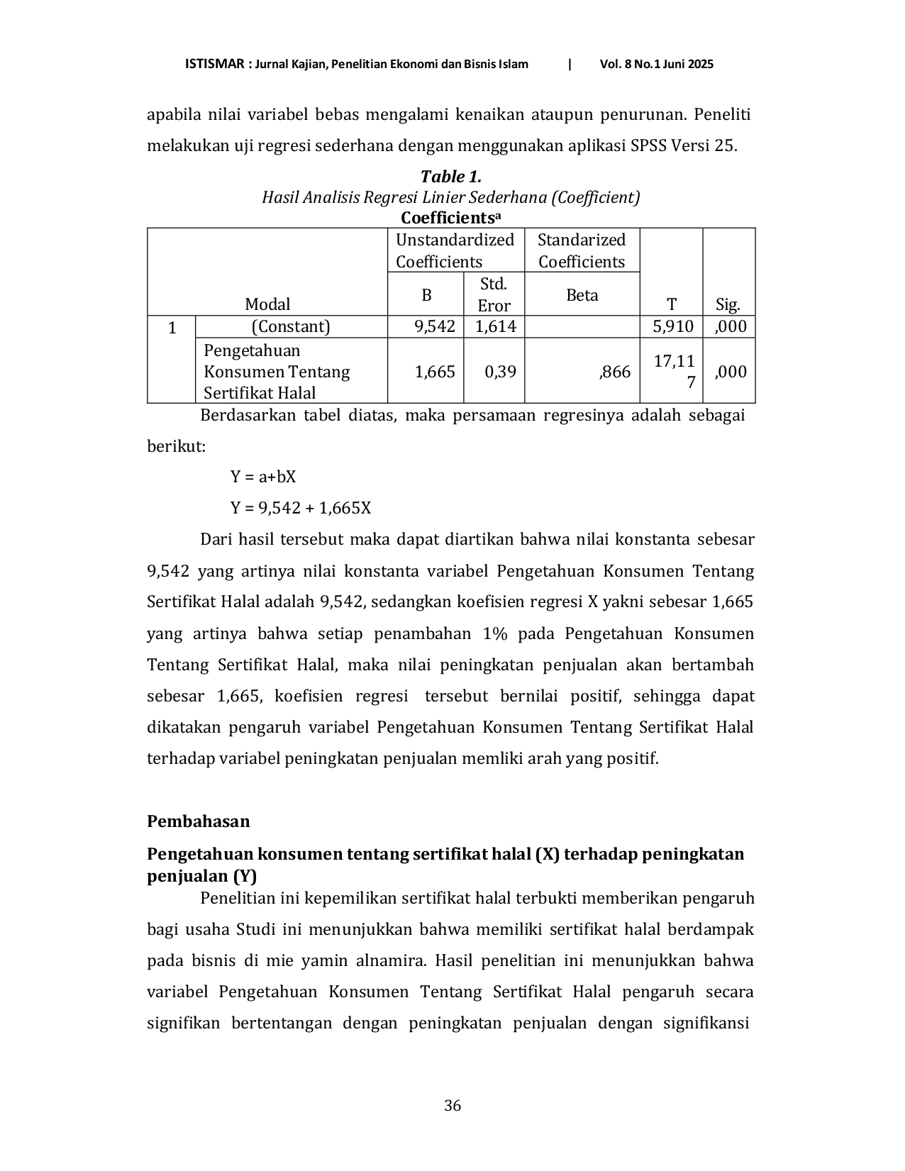ISTISMARISTISMARPenelitian ini bertujuan untuk mengetahui serta menganalisis pengaruh pengetahuan konsumen terhadap peningkatan penjualan mie yamin alnamira di Jombang. Metode penelitian yang digunakan adalah kuantitatif. Data dikumpulkan melalui penyebaran angket (kuisioner) dalam bentuk pertanyaan tertutup berupa Skala Likerts kepada 100 responden yang merupakan pemilik dan konsumen mie yamin alnamira di Jombang. Data dianalisis menggunakan Statistical Package for the Sosial Sciences (SPSS) versi 25. Hasil penelitian menyimpulkan bahwa terdapat pengaruh pengetahuan konsumen terhadap peningkatan penjualan mie yamin alnamira di Jombang.