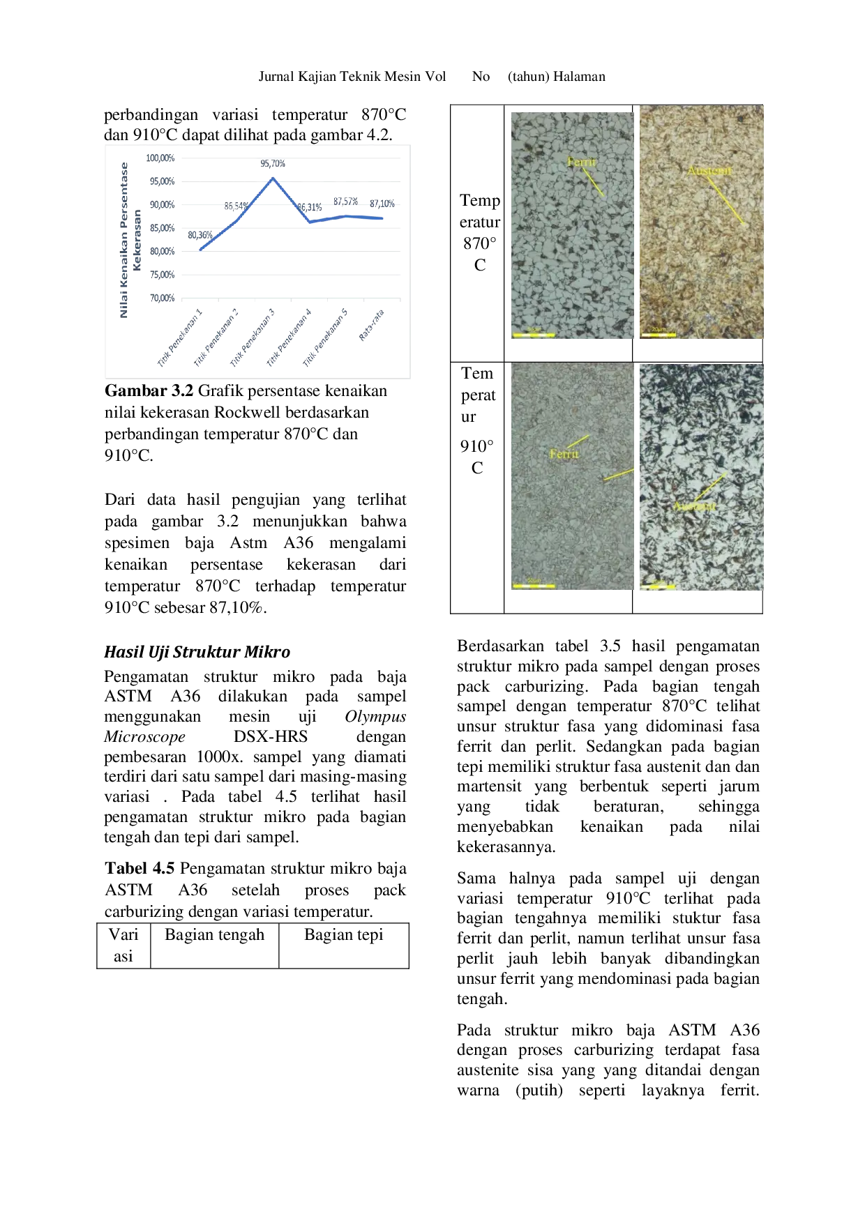 JURNAL KAJIAN TEKNIK MESINJURNAL KAJIAN TEKNIK MESINPada proses perlakuan panas, terdapat beberapa metode perlakuan panas pada baja karbon yaitu pack carburizing, carbonitriding, cyaniding, dan nitriding. pack carburizing merupakan proses perlakuan panas (heat treatment) yang dilakukan dengan cara mendifusikan unsur karbon pada permukaan logam yang kemudian dipanaskan pada suhu austenitnya. Tujuan pack carburizing yaitu untuk menaikkan kadar karbon pada lapisan permukaan baja sehingga didapatkan material baja yang memiliki permukaan keras dan sifat mekanik lain-nya. Dalam penelitian ini metode yang digunakan adalah metode penelitian kuantitatif eksperimental, yaitu metode uji coba dan analisis terhadap nilai kekerasan dan struktur mikro pada proses pack carburizing dengan variasi temperatur yang berbeda. Pada pengujian komposisi kimia terhadap sampel baja karbon rendah ASTM A36 sebelum dan sesudah proses pack carburizing terjadi kenaikan kadar karbon sebesar 94,4%. 2. Pada pengujian kekerasan Rockwell setelah proses pack carburizing 870°C dengan arang sekam padi 90% dan BaCO3 10% didapat nilai kekerasan rata-rata sebesar 22,41 HRC dan case depth 179.64 µm. 3. Pada pengujian kekerasan Rockwell t setelah proses pack carburizing 910°C dengan arang sekam padi 90% dan BaCO3 10% didapat nilai kekerasan rata-rata sebesar 41,93 HRC dan case depth 186,54 µm. 4. Berdasarkan perbandingan variasi temperatur 870°C dan 910°C terhadap nilai persentase kenaikan karbon terjadi kenaikan sebesar 87,10%. 5. Berdasarkan struktur mikro pada temperatur 870°C didapatkan struktur fasa 6. Berdasarkan struktur mikro pada temperatur 910°C didapatkan struktur fasa.
