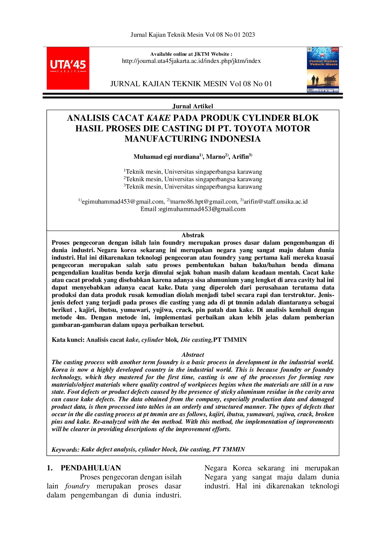 JURNAL KAJIAN TEKNIK MESINJURNAL KAJIAN TEKNIK MESINProses pengecoran dengan istilah lain foundry merupakan proses dasar dalam pengembangan di dunia industri. Negara Korea sekarang ini merupakan negara yang sangat maju dalam dunia industri. Hal ini dikarenakan teknologi pengecoran atau foundry yang pertama kali mereka kuasai. Pengecoran merupakan salah satu proses pembentukan bahan baku/bahan benda dimana pengendalian kualitas benda kerja dimulai sejak bahan masih dalam keadaan mentah. Cacat kake atau cacat produk yang disebabkan karena adanya sisa aluminium yang lengket di area cavity hal ini dapat menyebabkan adanya cacat kake. Data yang diperoleh dari perusahaan terutama data produksi dan data produk rusak kemudian diolah menjadi tabel secara rapi dan terstruktur. Jenis-jenis defect yang terjadi pada proses die casting yang ada di PT TMMIN adalah di antaranya sebagai berikut, kajiri, ibutsu, yumawari, yujiwa, crack, pin patah dan kake. Dianalisis kembali dengan metode 4M. Dengan metode ini, implementasi perbaikan akan lebih jelas dalam pemberian gambaran-gambaran dalam upaya perbaikan tersebut.