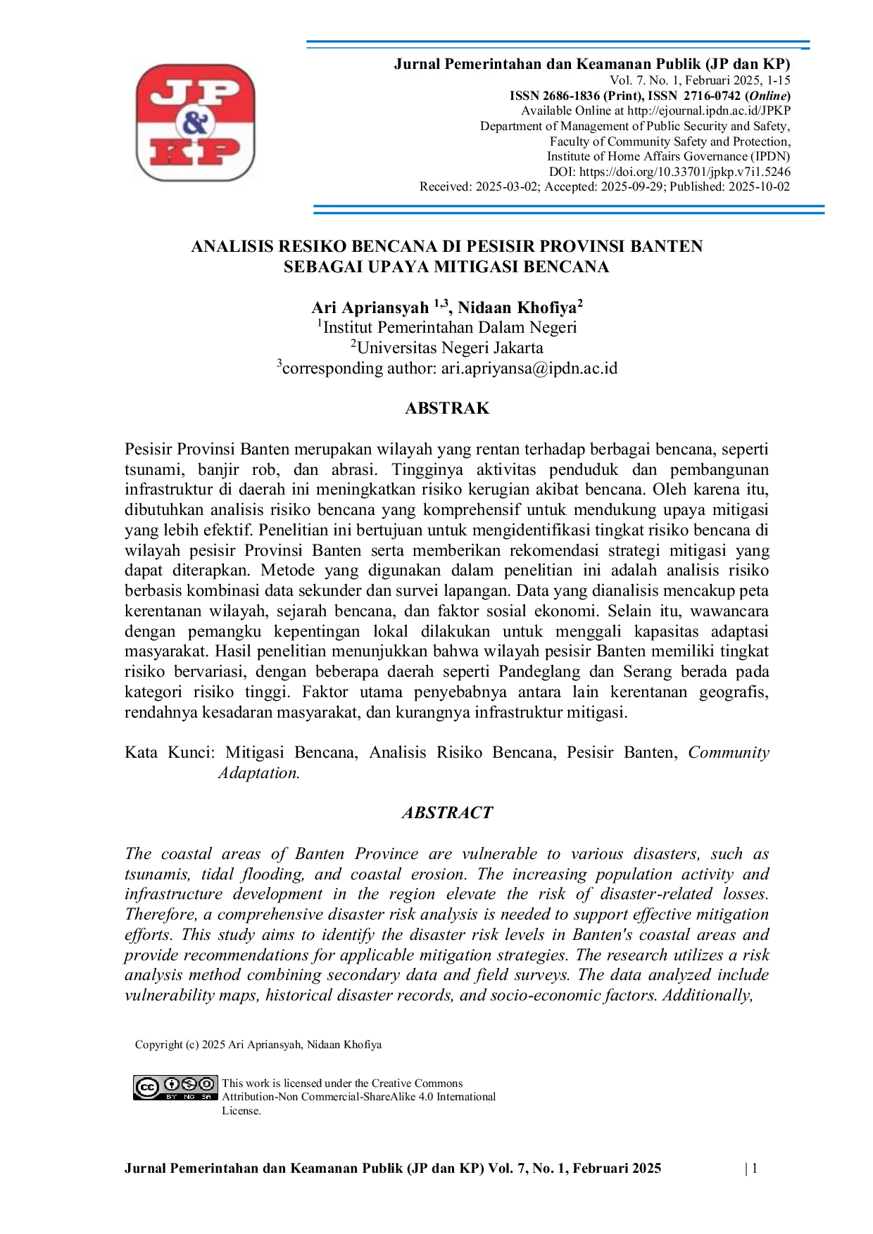 Jurnal Pemerintahan Dan Keamanan Publik (JP dan KP)Jurnal Pemerintahan Dan Keamanan Publik (JP dan KP)Pesisir Provinsi Banten merupakan wilayah yang rentan terhadap berbagai bencana, seperti tsunami, banjir rob, dan abrasi. Tingginya aktivitas penduduk dan pembangunan infrastruktur di daerah ini meningkatkan risiko kerugian akibat bencana. Oleh karena itu, dibutuhkan analisis risiko bencana yang komprehensif untuk mendukung upaya mitigasi yang lebih efektif. Penelitian ini bertujuan untuk mengidentifikasi tingkat risiko bencana di wilayah pesisir Provinsi Banten serta memberikan rekomendasi strategi mitigasi yang dapat diterapkan. Metode yang digunakan dalam penelitian ini adalah analisis risiko berbasis kombinasi data sekunder dan survei lapangan. Data yang dianalisis mencakup peta kerentanan wilayah, sejarah bencana, dan faktor sosial ekonomi. Selain itu, wawancara dengan pemangku kepentingan lokal dilakukan untuk menggali kapasitas adaptasi masyarakat. Hasil penelitian menunjukkan bahwa wilayah pesisir Banten memiliki tingkat risiko bervariasi, dengan beberapa daerah seperti Pandeglang dan Serang berada pada kategori risiko tinggi. Faktor utama penyebabnya antara lain kerentanan geografis, rendahnya kesadaran masyarakat, dan kurangnya infrastruktur mitigasi.